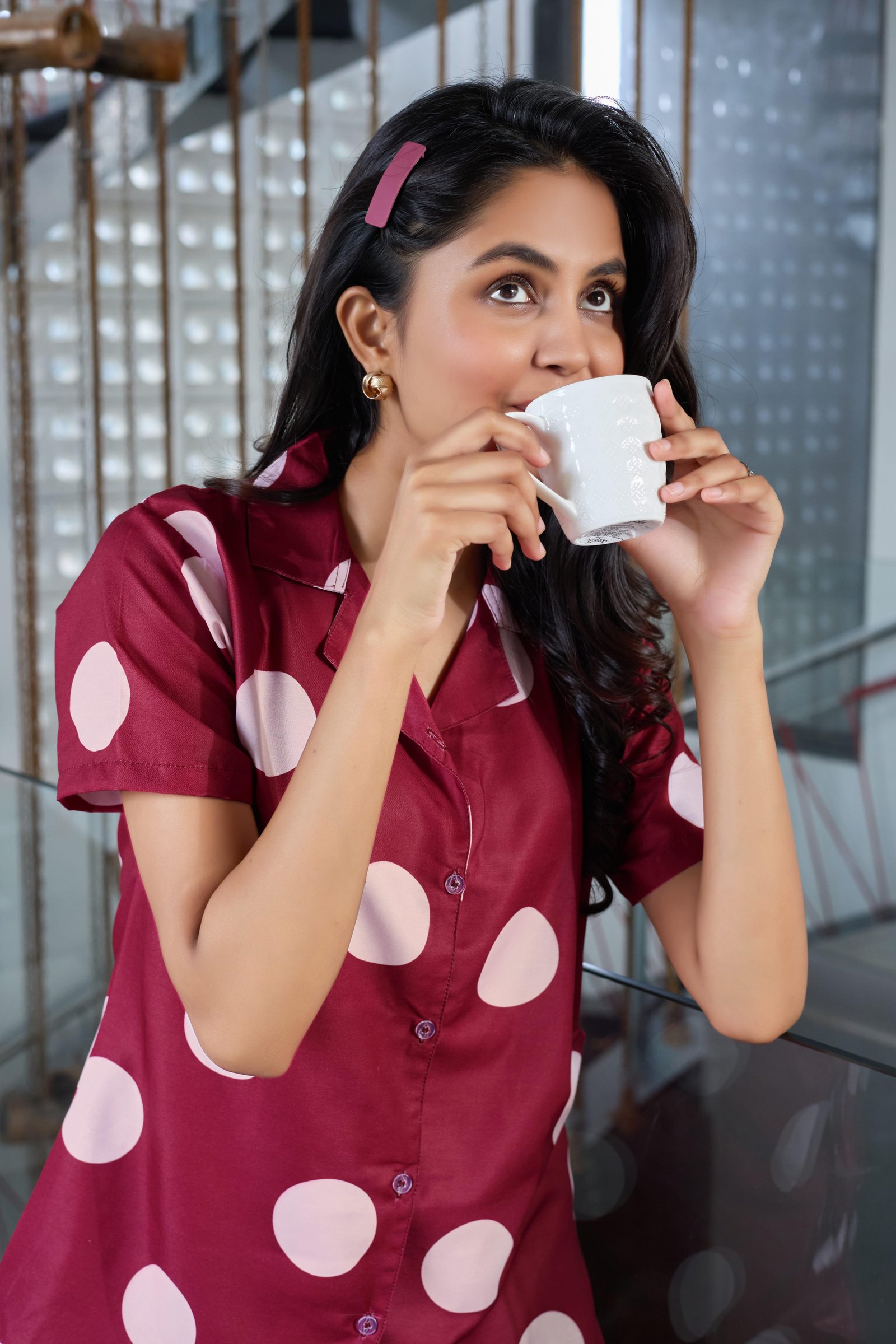 Add a playful charm to your bedtime routine with the Berry Bliss Polka Dot Nightwear Set. Crafted in a rich maroon shade with soft blush pink polka dots, this two-piece night suit blends comfort with a fun, stylish look. The short-sleeve, button-down shirt features a relaxed collar and smooth finish, paired with straight-fit pajama pants for all-night ease. Perfect for lounging at home, sleepwear, or cozy evenings.