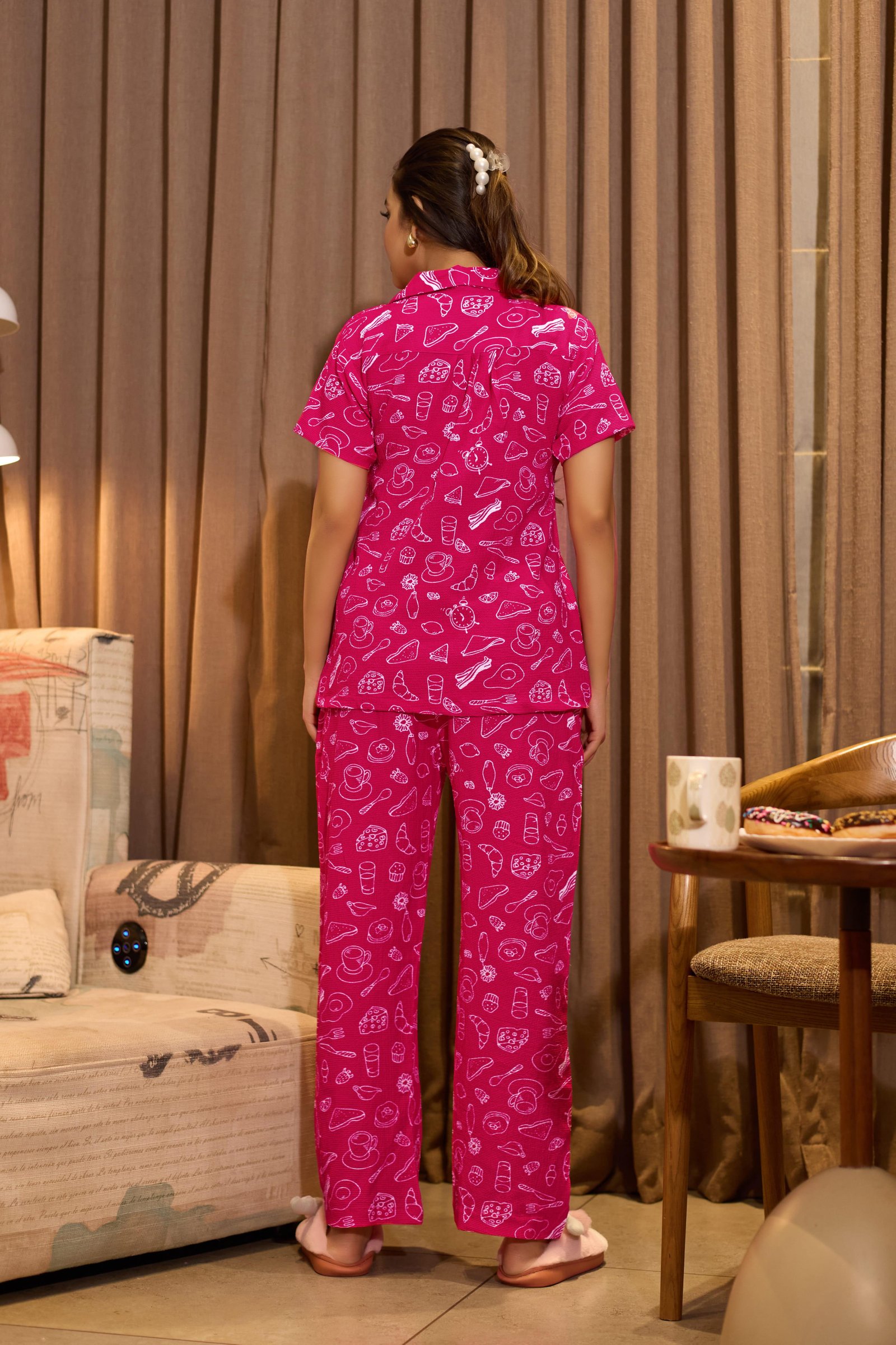Add a pop of fun and comfort to your homewear collection with the Berry Bliss Printed Nightwear Set. Designed in a vibrant berry pink shade, this two-piece set features playful white doodle-style prints that bring a cheerful, youthful vibe. The short-sleeve, collared button-down top pairs perfectly with relaxed straight-fit pajama pants, offering all-day ease and breathable comfort.