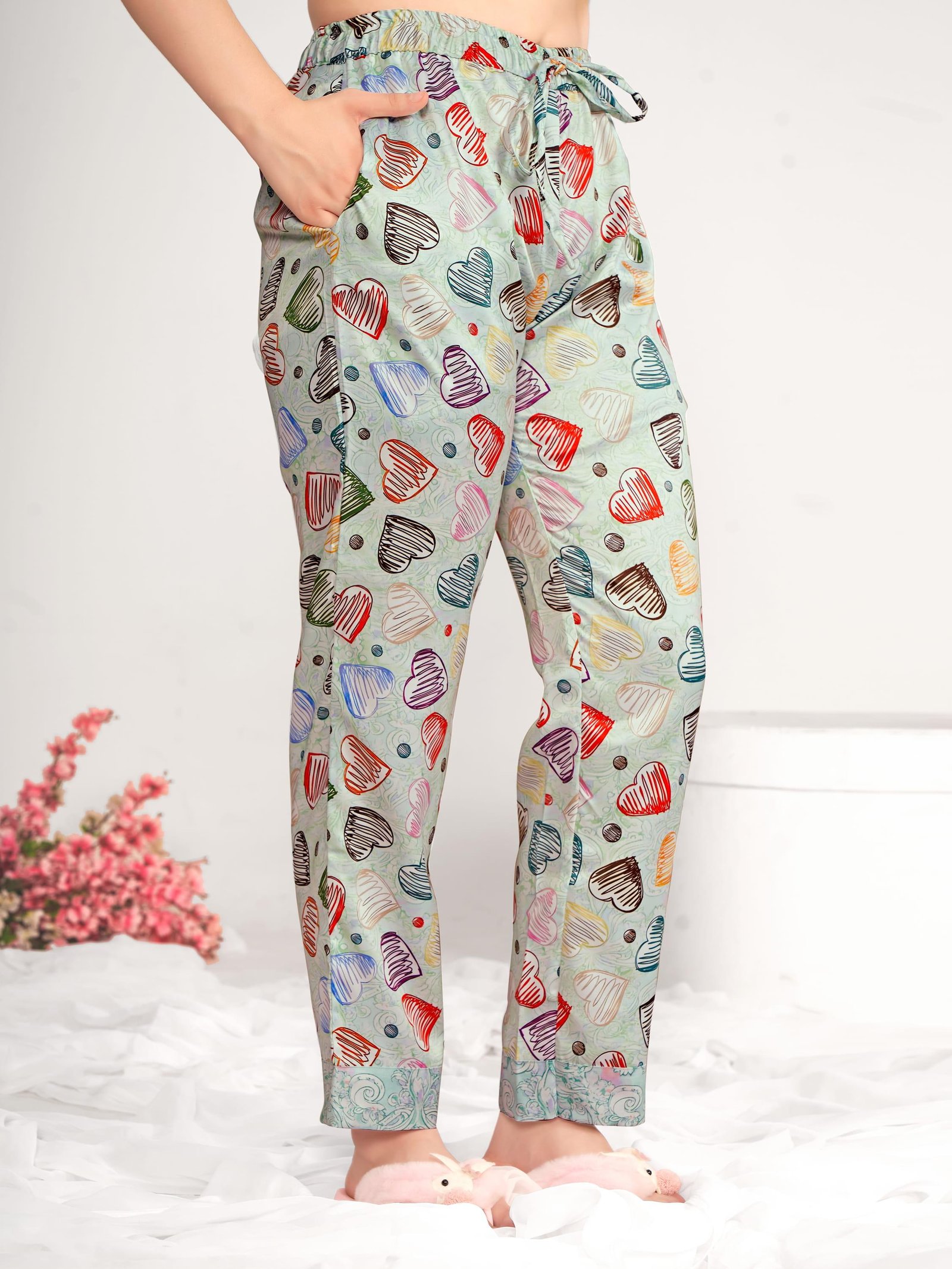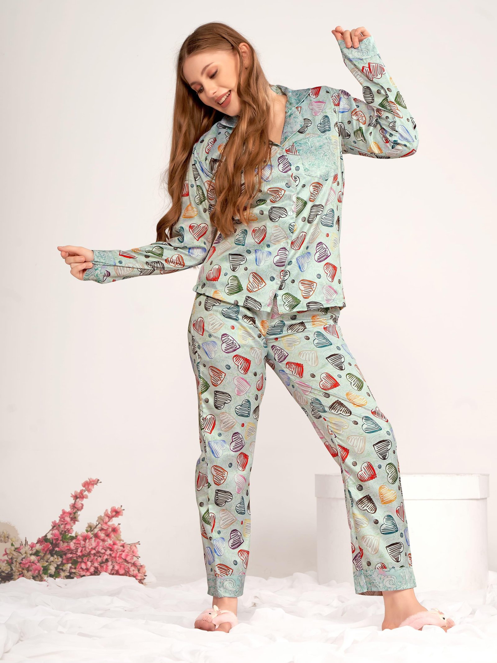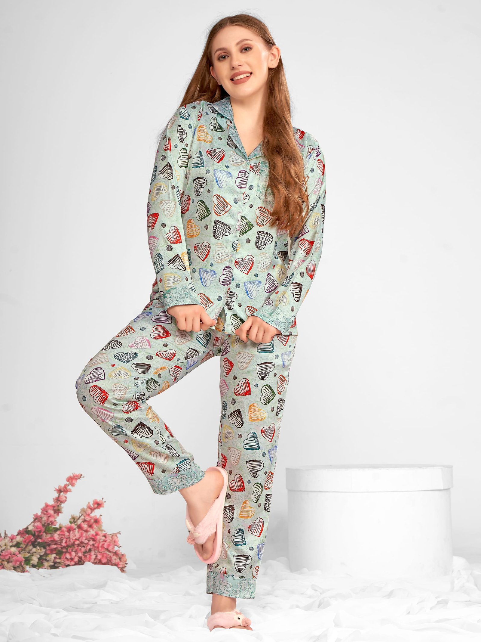Add charm and comfort to your nightwear wardrobe with this stylish women’s printed night suit set. Designed in a refreshing mint green base, the set features a playful multicolor heart print that adds a cheerful touch. The button-down shirt-style top with a classic collar and full sleeves pairs perfectly with matching straight-fit pajamas. Crafted from soft, breathable fabric, this night suit ensures all-night comfort and is ideal for sleeping, lounging, or relaxed home wear.