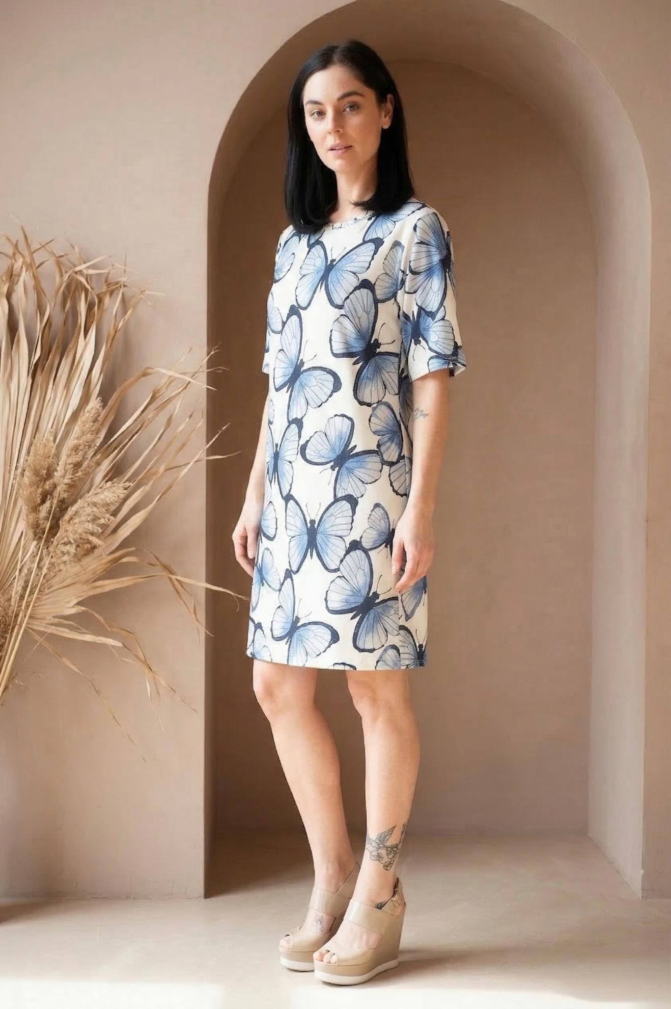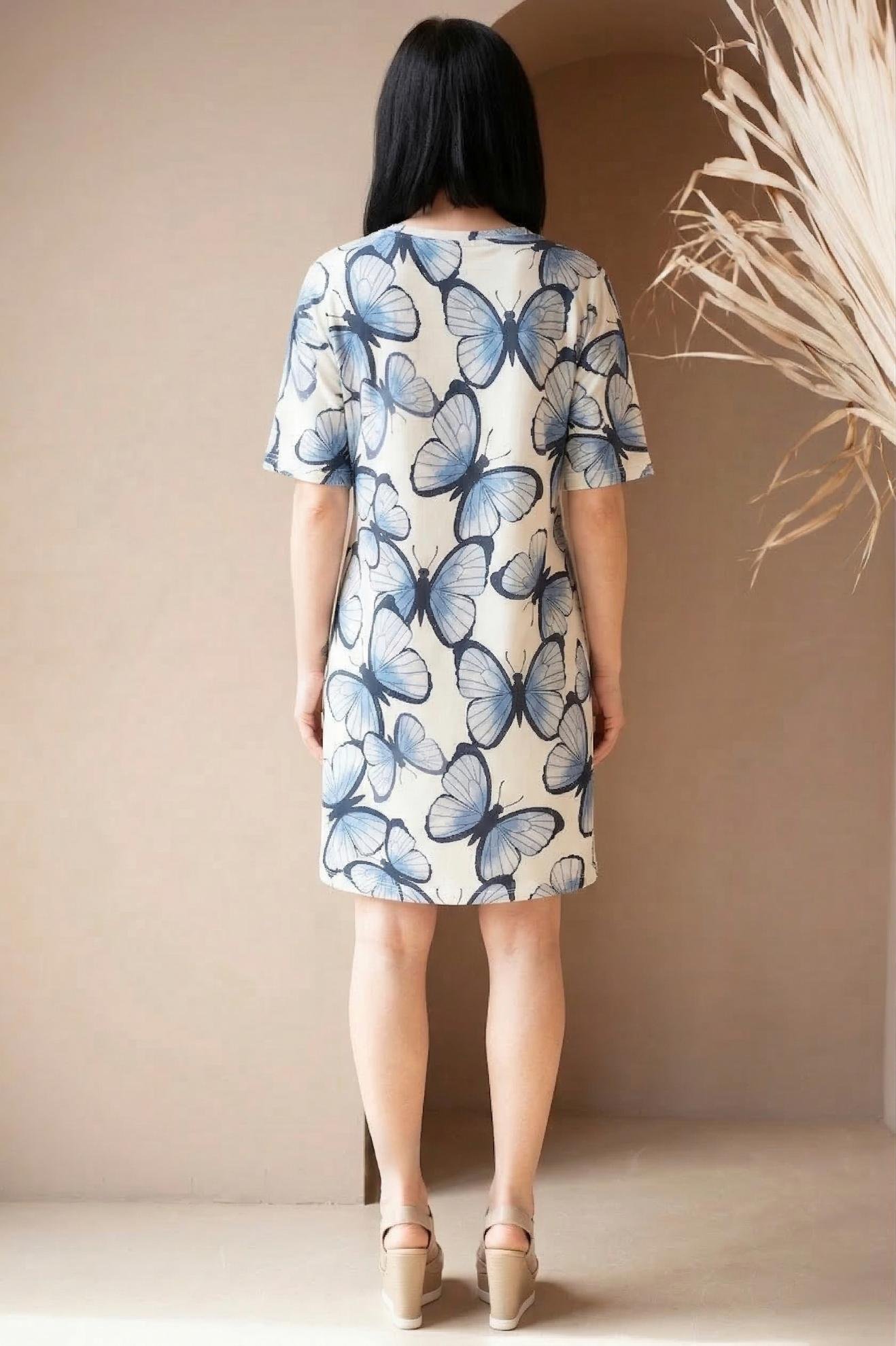 Buy Cotton Short Nighty for Women Online in India. Flutter into a peaceful slumber with our Blue Butterfly Bliss Sleep Dress. This charming short-sleeve nightgown features a vibrant all-over print of beautiful blue butterflies on a fresh white background. The relaxed t-shirt style and soft, lightweight fabric make it the perfect choice for a comfortable night's sleep or lounging around the house on a lazy morning. Its playful design adds a touch of whimsy to your sleepwear collection.