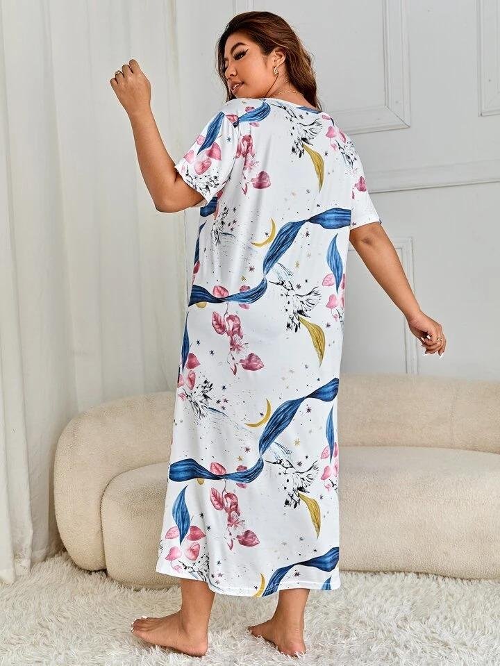 Buy Long Nighty for Girls Online. Drift into comfort and effortless style with the Moonlit Bloom Printed Lounge Maxi Dress. Designed for relaxed elegance, this soft, flowing dress features a whimsical floral and celestial-inspired print with delicate blossoms, sweeping blue accents, and subtle moon details. The loose, breathable silhouette offers all-day comfort, making it perfect for lounging at home, casual mornings, or cozy evenings. With its easy pull-on design and flattering length, this dress blends comfort with understated charm.