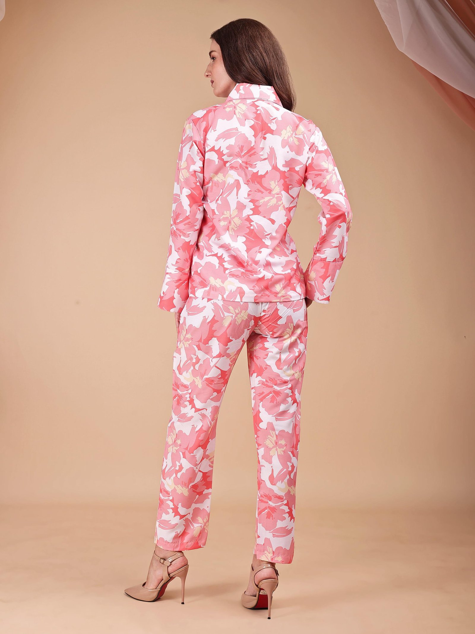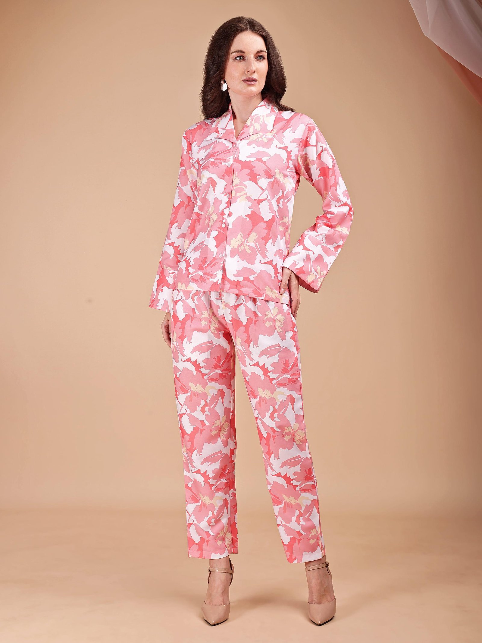 Step into refined comfort with our Coral Bloom Floral Co-ord Set, crafted in a graceful blend of coral pink, soft blush, and ivory tones. Featuring an elegant all-over floral print, this set balances femininity and modern style effortlessly. The tailored button-down top paired with straight-fit trousers makes it perfect for relaxed days, stylish lounging, or elevated casual wear. Soft hues and fluid fabric ensure a fresh, flattering look throughout the day.