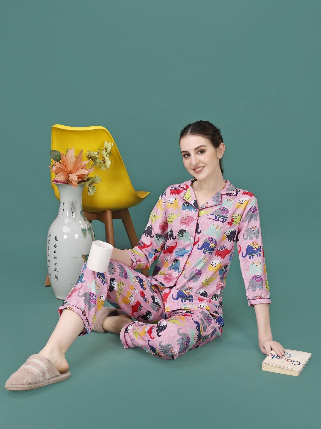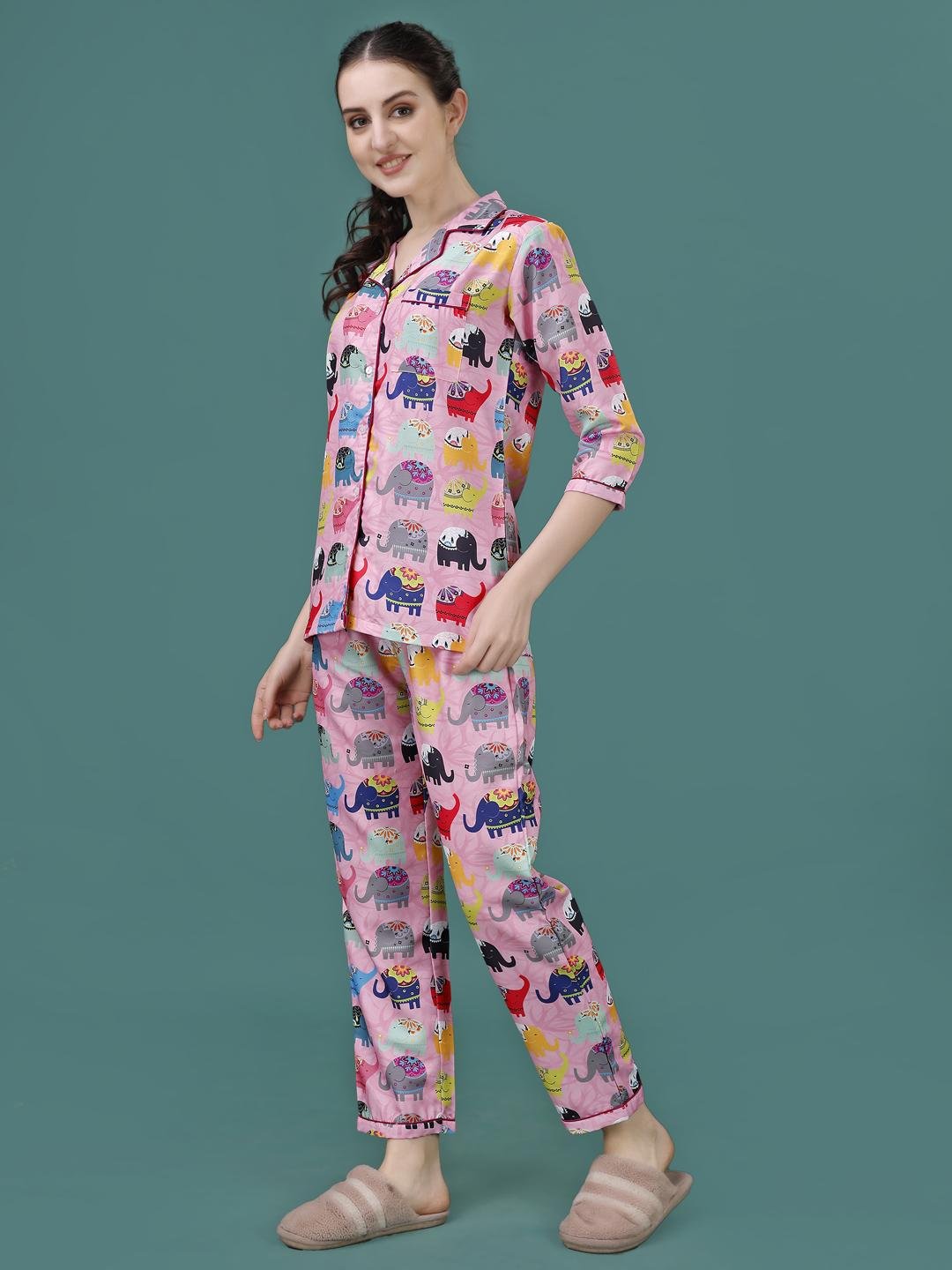 Sleep in playful comfort with the Pink Elephant Parade Women’s Nightwear Pajama Set. Designed in a cheerful bubblegum pink base, this set features adorable multicolor elephant prints that add a fun, youthful charm. The shirt-style top with button closure and contrast piping pairs perfectly with relaxed-fit pajama pants. Crafted from soft, breathable fabric, this nightwear set ensures all-night comfort and effortless lounging at home.