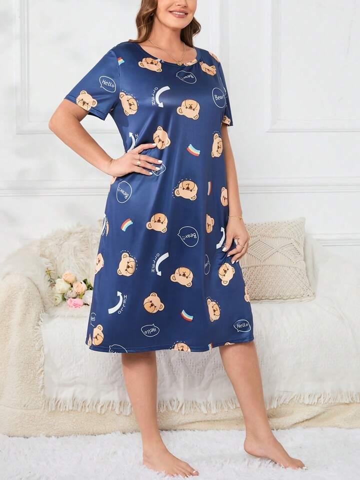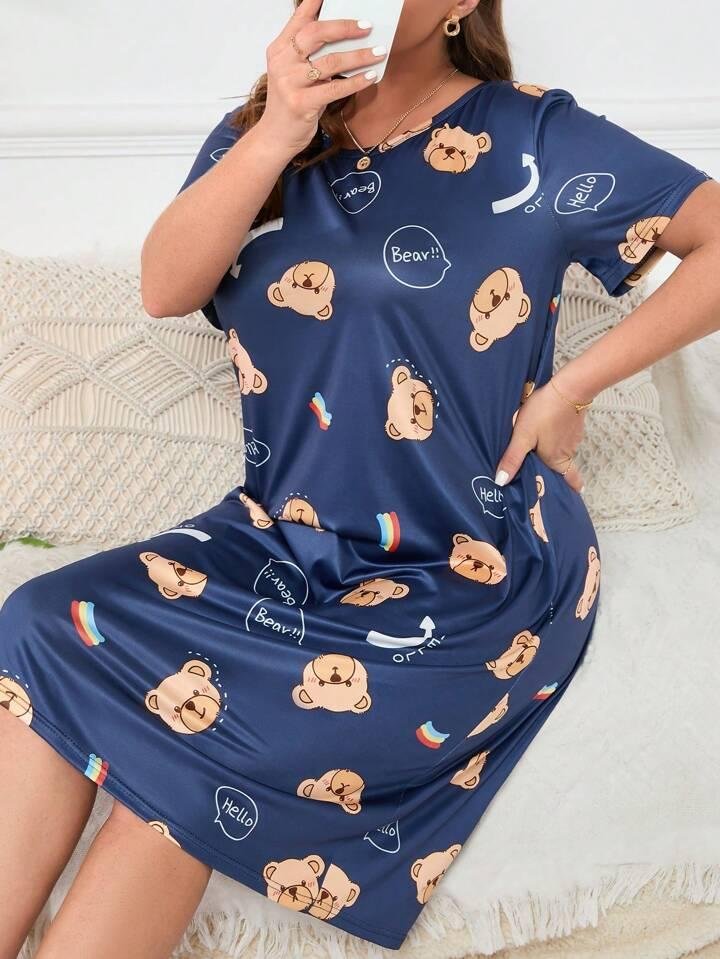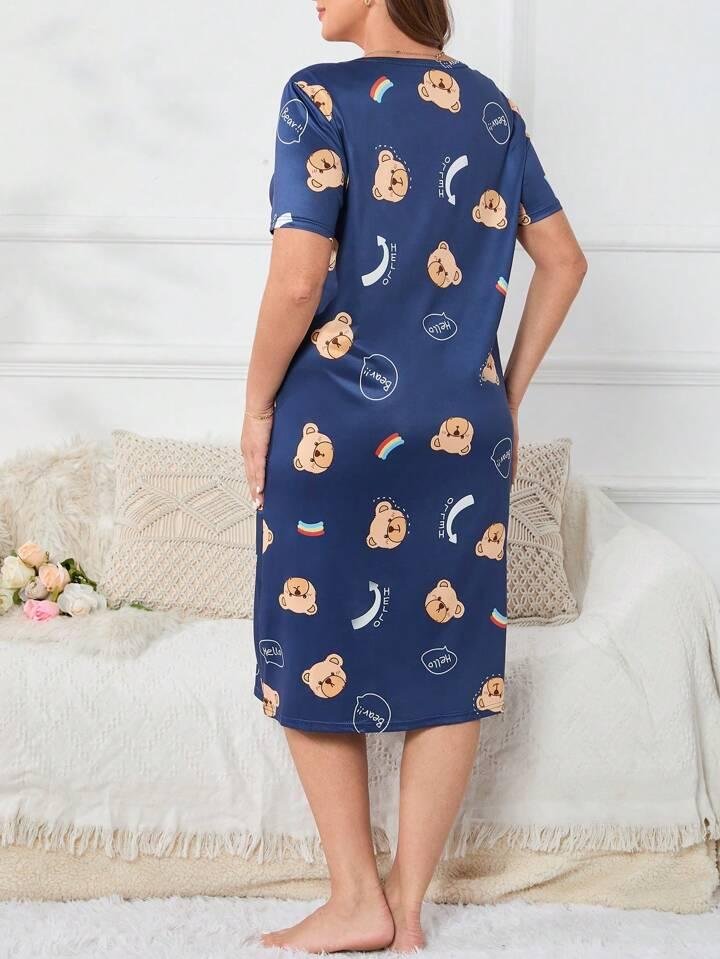 Navy Blue Teddy Bear Print Short Nighty for Girls