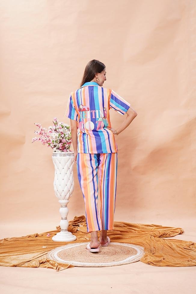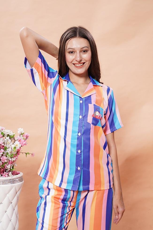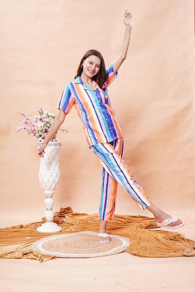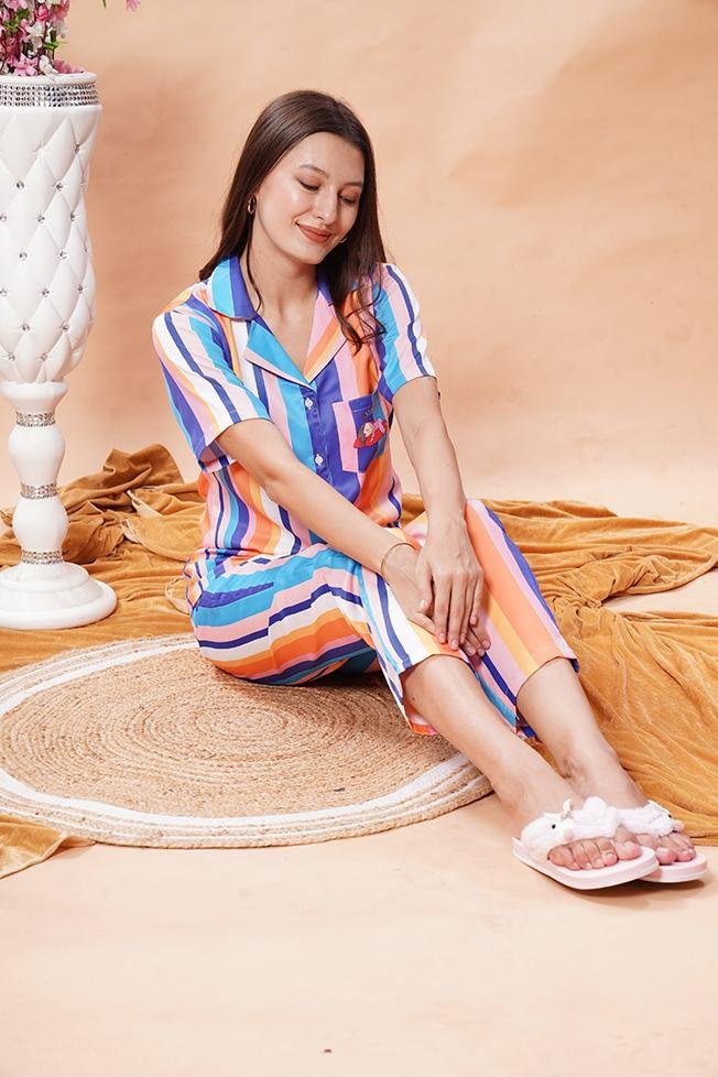 Brighten up your nightwear wardrobe with this stylish women’s multicolor striped night suit set. Featuring a trendy button-down shirt style top with short sleeves and a matching full-length pajama, this set combines comfort with modern design. The vibrant vertical stripes in shades of orange, blue, pink, and white add a cheerful touch, while the soft, breathable fabric ensures all-night comfort. Ideal for sleeping, lounging, or relaxed home wear, this night suit is a perfect blend of fashion and ease.