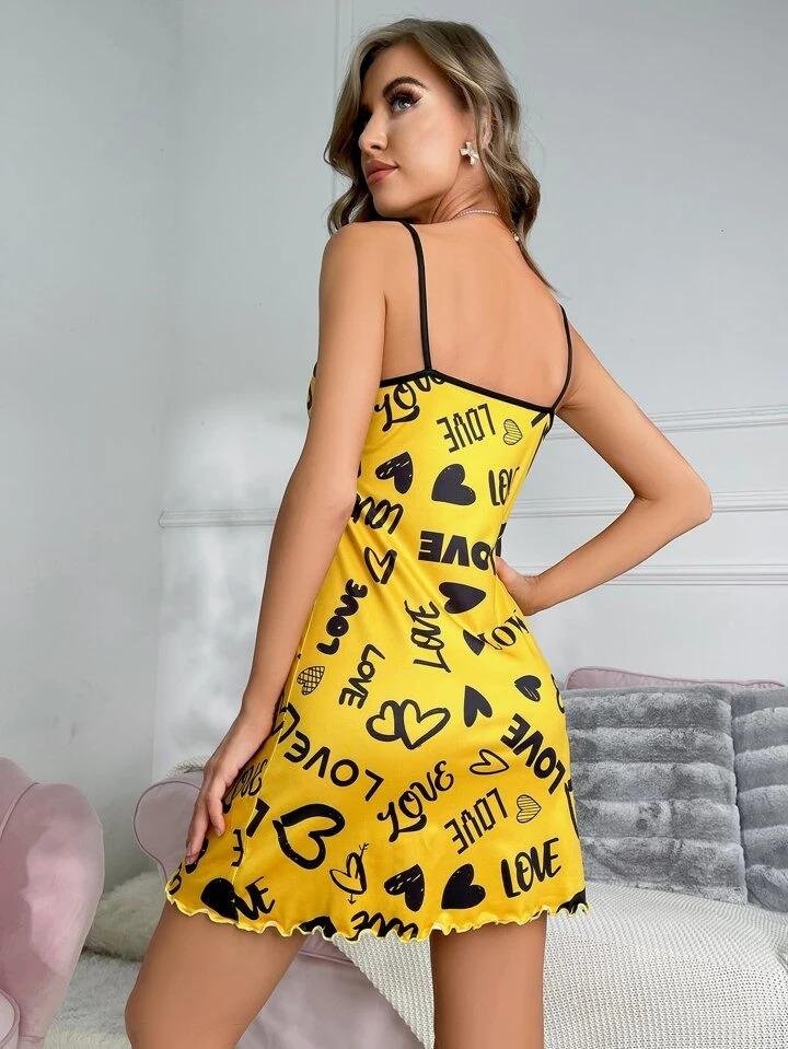 Buy Spaghetti Strap Mini Dress Cami Nighty - Crafted from soft, breathable fabric, this dress offers all-day comfort while keeping your look effortlessly stylish. The bright yellow base color adds a vibrant pop, while the contrast black print creates a striking visual appeal. Pair it with heels for a party look or sneakers for a casual chic vibe.