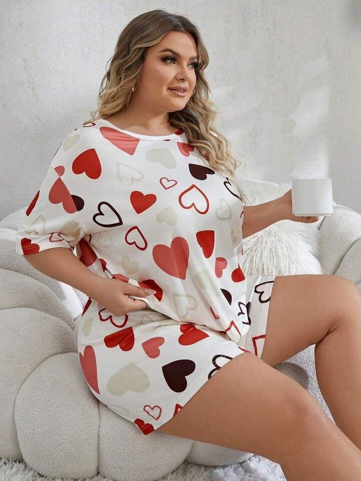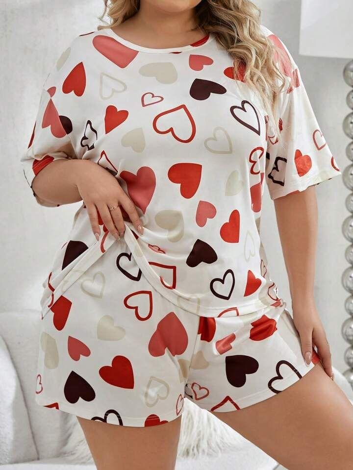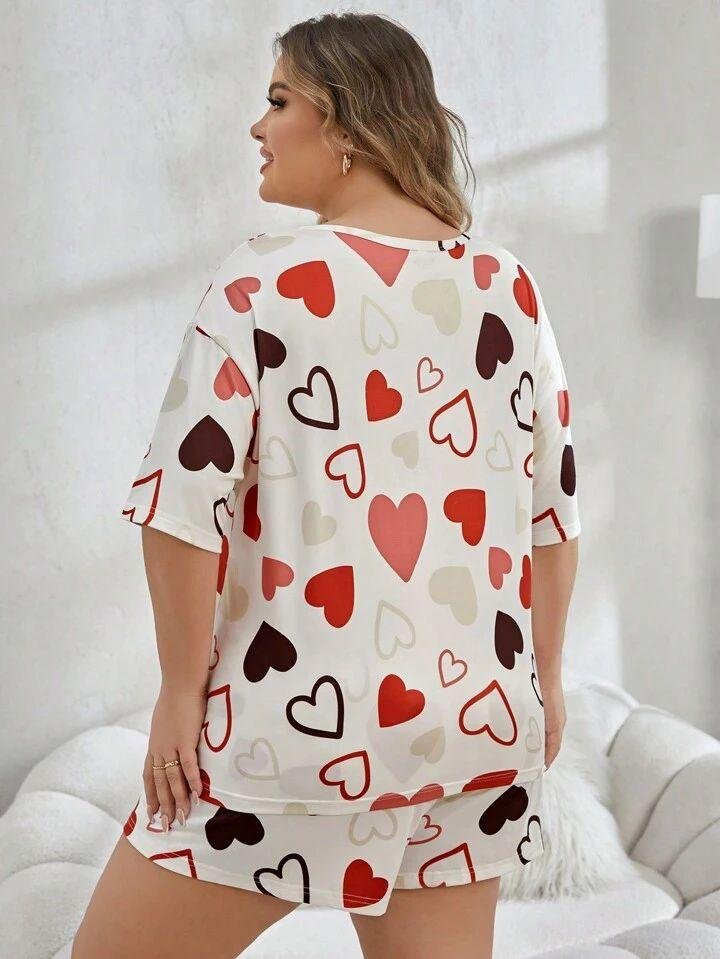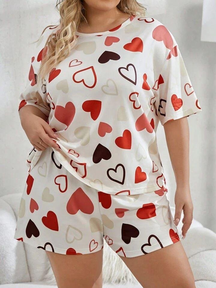 Cream White Heart Print Short Night Suit for Women
