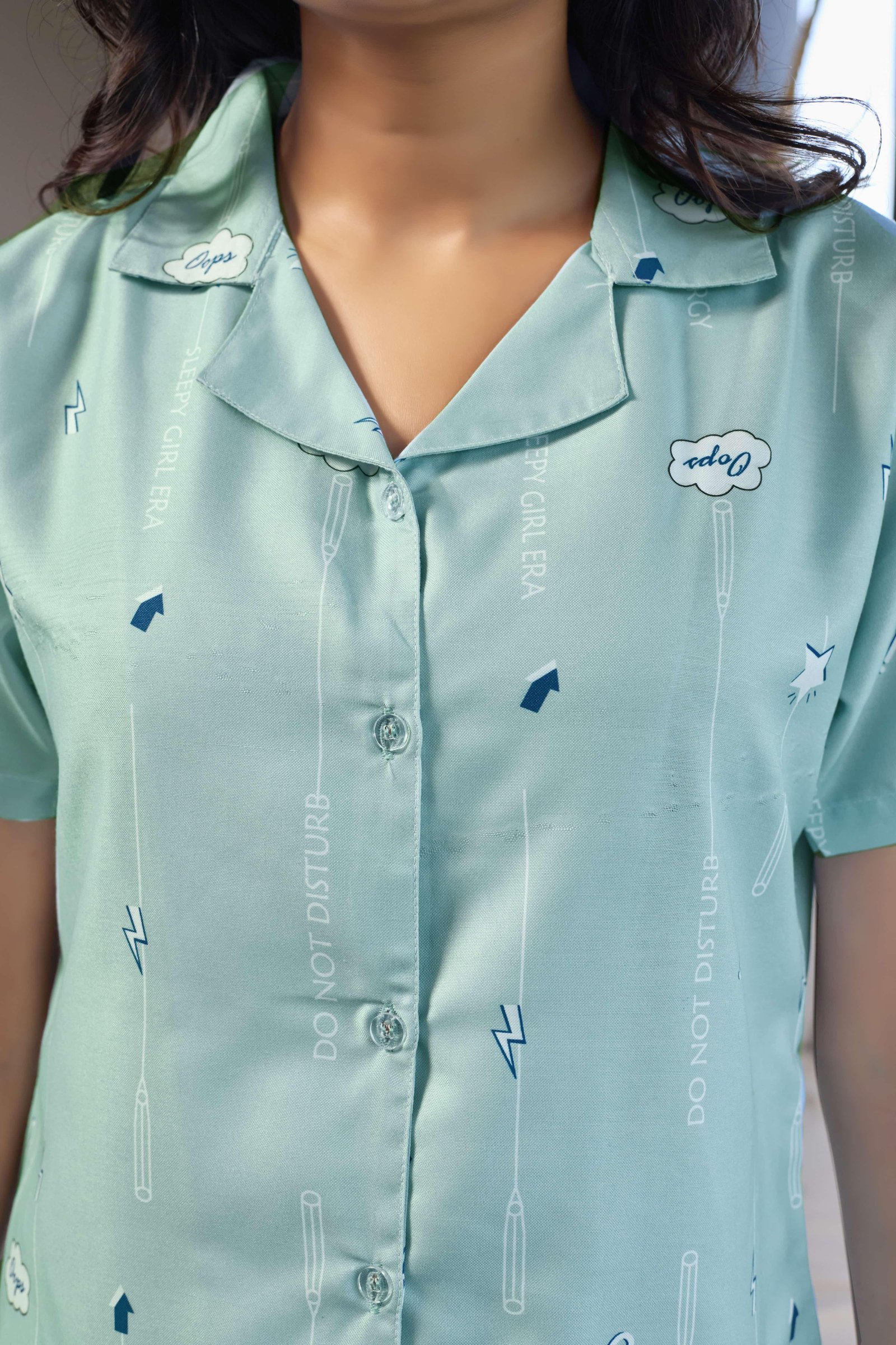Step into calm comfort with the Mint Breeze Pastel Green Nightwear Set. Designed in a refreshing mint green shade with delicate all-over prints, this two-piece set offers a soothing and modern look. The short-sleeve button-down shirt provides a relaxed fit, while the straight-fit pajama pants ensure ease of movement. Soft on the skin and lightweight, this set is perfect for nightwear, lounging, or relaxed indoor wear.