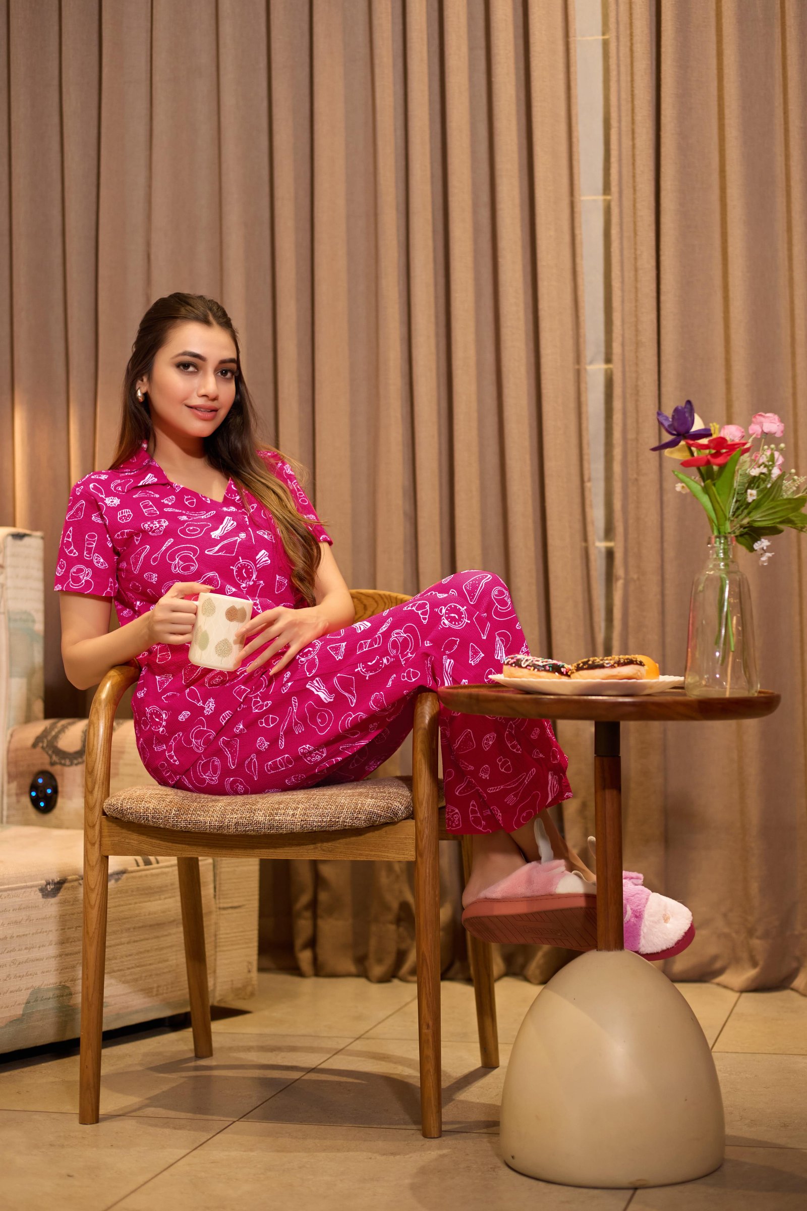 Add a pop of fun and comfort to your homewear collection with the Berry Bliss Printed Nightwear Set. Designed in a vibrant berry pink shade, this two-piece set features playful white doodle-style prints that bring a cheerful, youthful vibe. The short-sleeve, collared button-down top pairs perfectly with relaxed straight-fit pajama pants, offering all-day ease and breathable comfort.