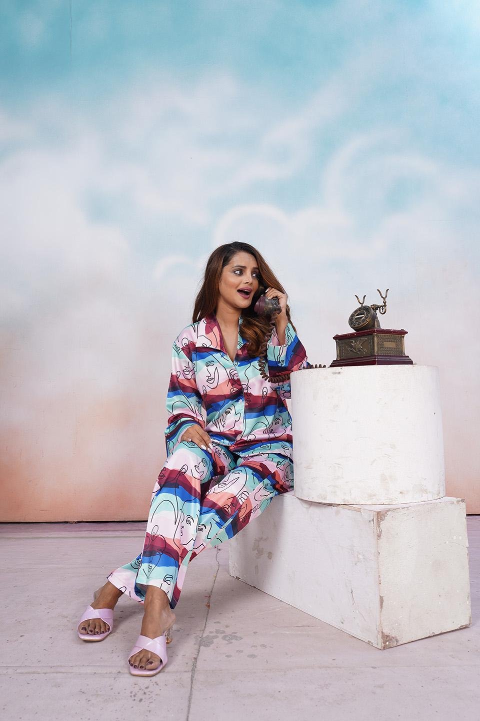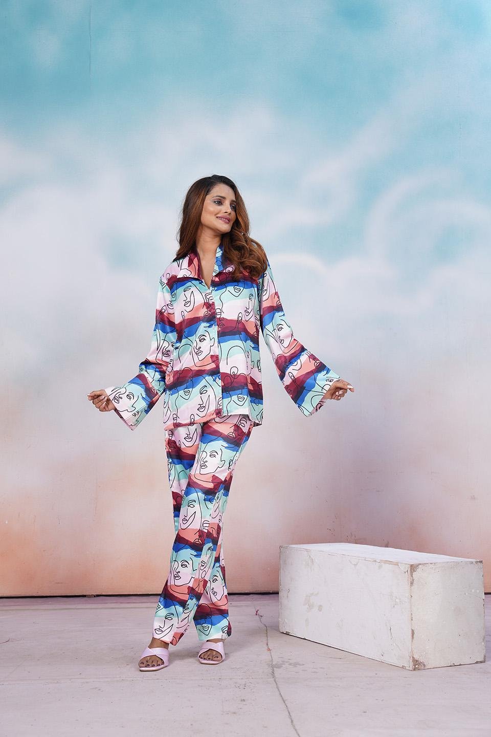 Make a bold yet elegant statement with the Abstract Muse Women’s Nightwear Pajama Set. Designed with an artistic face-line print layered over soft pastel color blocks, this set blends contemporary art with everyday comfort. The relaxed button-down top paired with straight-fit pajama pants offers effortless movement and a flattering drape. Crafted from soft, breathable fabric, it’s perfect for lounging in style or enjoying peaceful nights with a touch of creative flair.