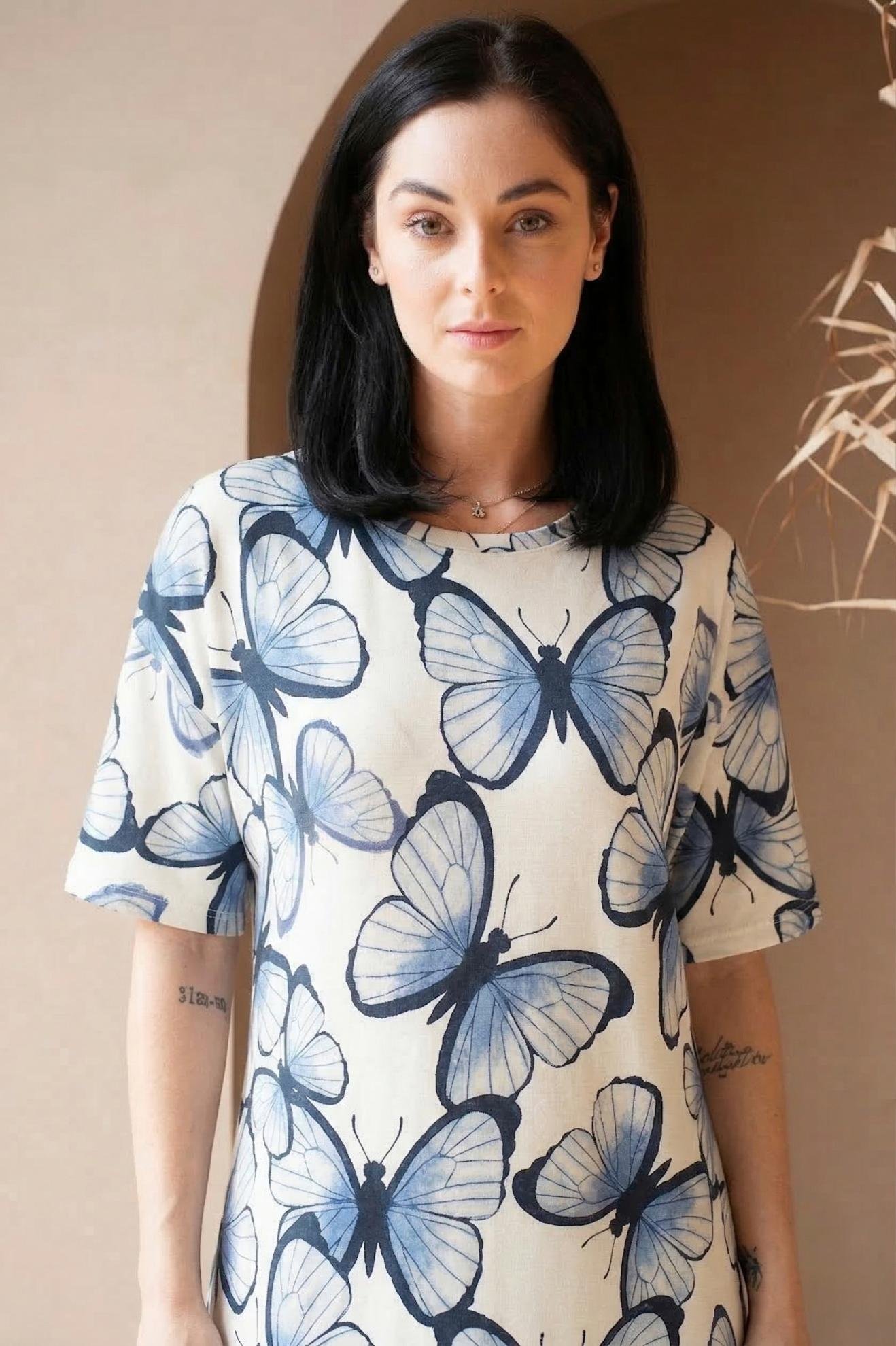 Buy Cotton Short Nighty for Women Online in India. Flutter into a peaceful slumber with our Blue Butterfly Bliss Sleep Dress. This charming short-sleeve nightgown features a vibrant all-over print of beautiful blue butterflies on a fresh white background. The relaxed t-shirt style and soft, lightweight fabric make it the perfect choice for a comfortable night's sleep or lounging around the house on a lazy morning. Its playful design adds a touch of whimsy to your sleepwear collection.