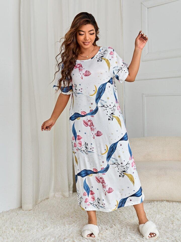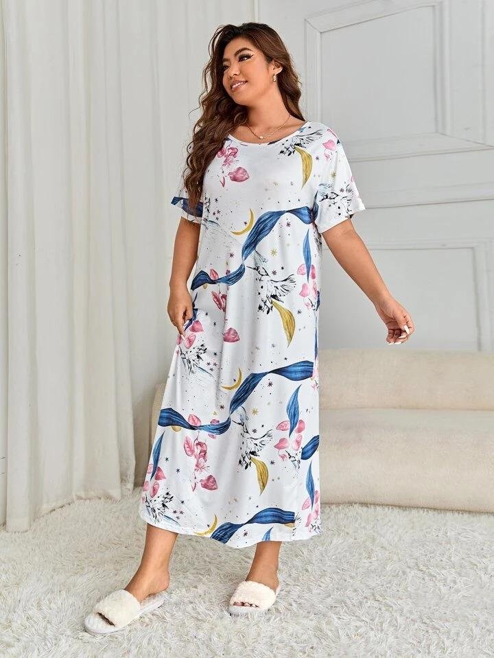 Buy Long Nighty for Girls Online. Drift into comfort and effortless style with the Moonlit Bloom Printed Lounge Maxi Dress. Designed for relaxed elegance, this soft, flowing dress features a whimsical floral and celestial-inspired print with delicate blossoms, sweeping blue accents, and subtle moon details. The loose, breathable silhouette offers all-day comfort, making it perfect for lounging at home, casual mornings, or cozy evenings. With its easy pull-on design and flattering length, this dress blends comfort with understated charm.