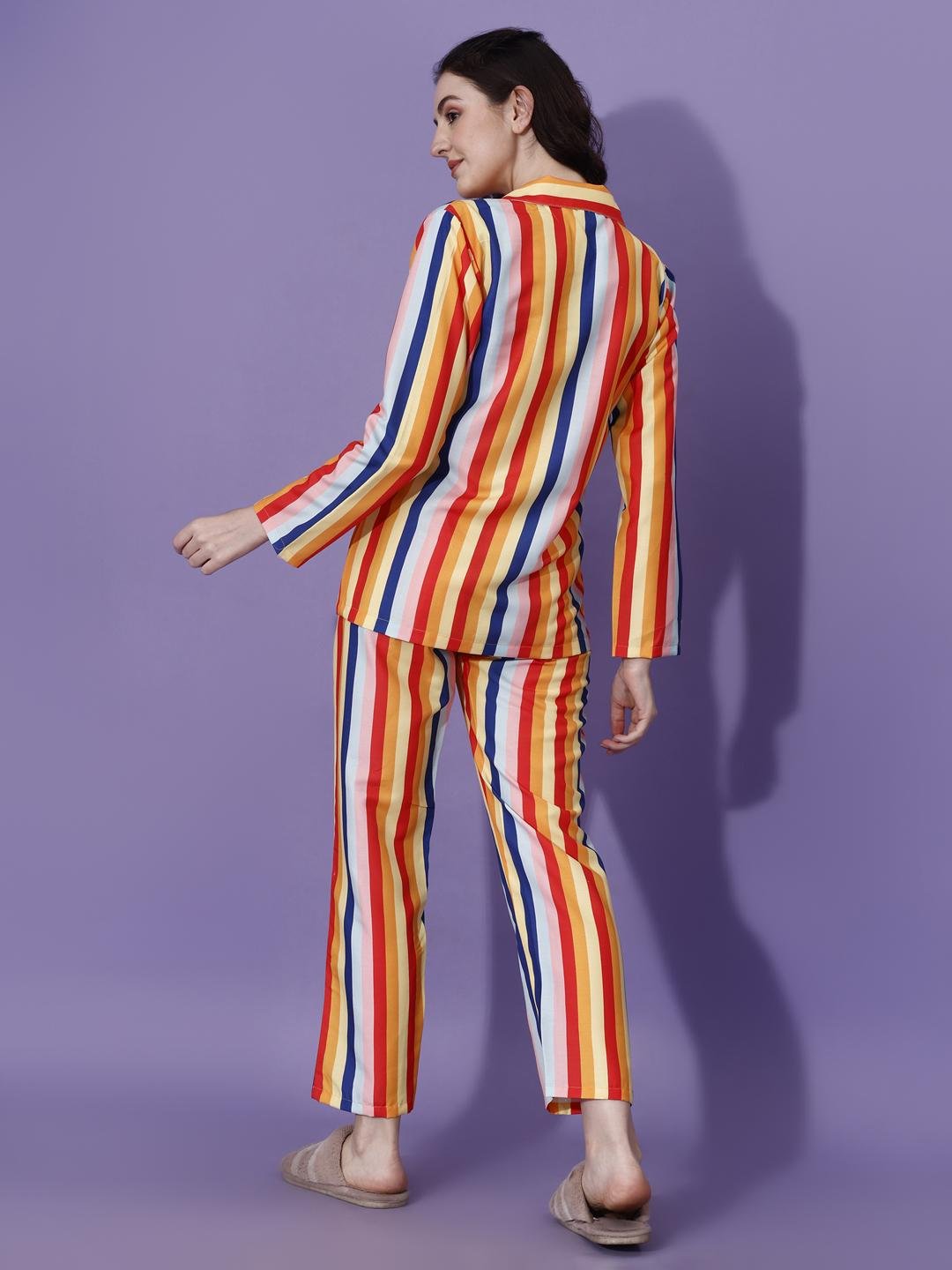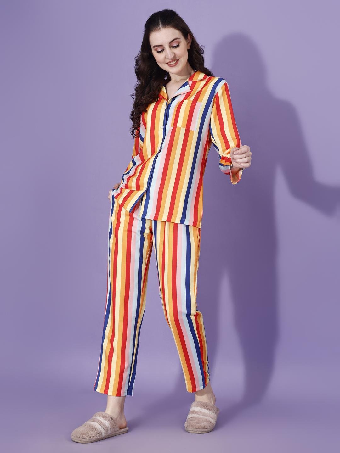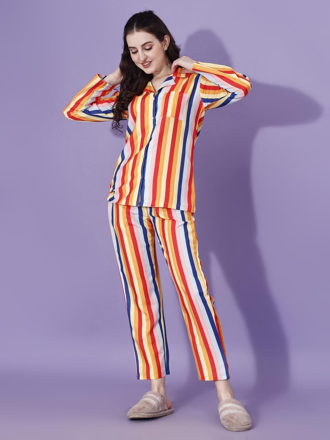 Bring vibrant comfort to your loungewear collection with this stylish multicolor striped pajama set. Designed with bold vertical stripes in warm tones of red, yellow, orange, blue, and soft neutrals, this set adds a cheerful and modern touch to everyday relaxation.