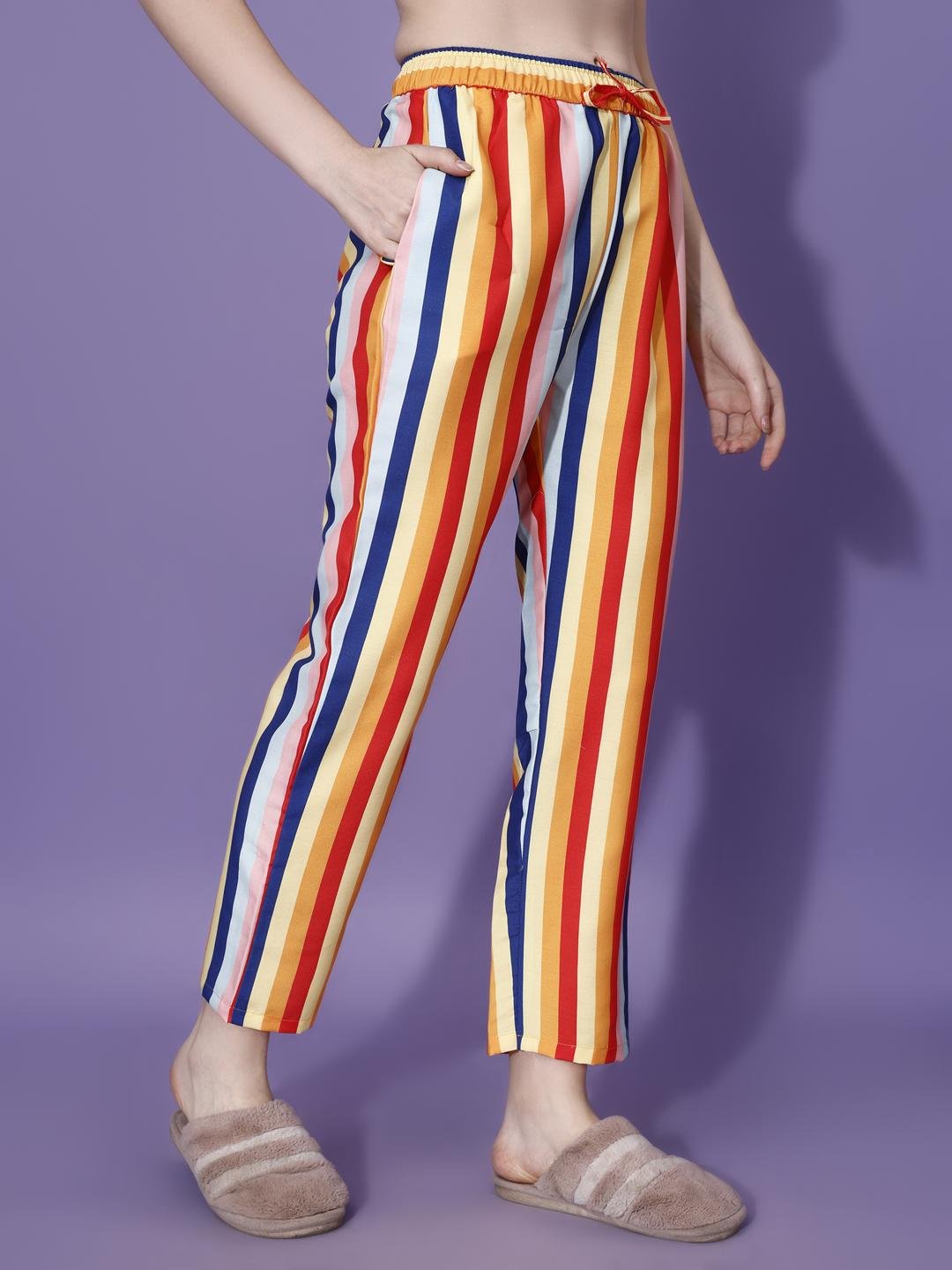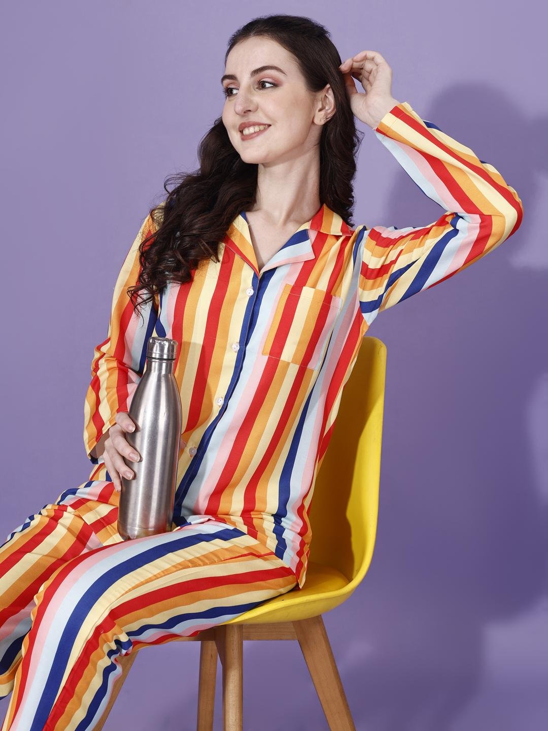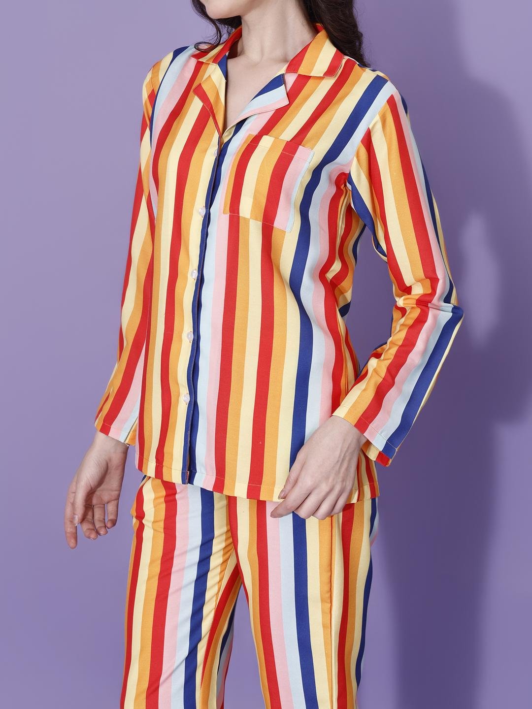 Bring vibrant comfort to your loungewear collection with this stylish multicolor striped pajama set. Designed with bold vertical stripes in warm tones of red, yellow, orange, blue, and soft neutrals, this set adds a cheerful and modern touch to everyday relaxation.