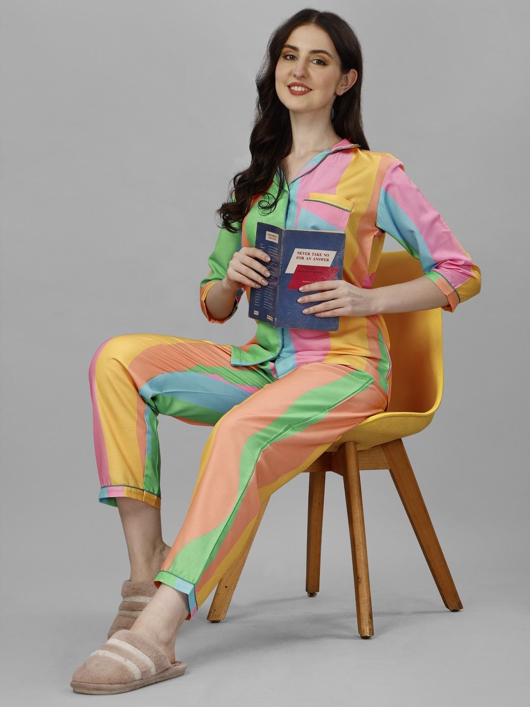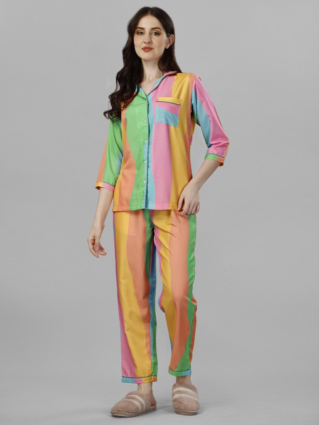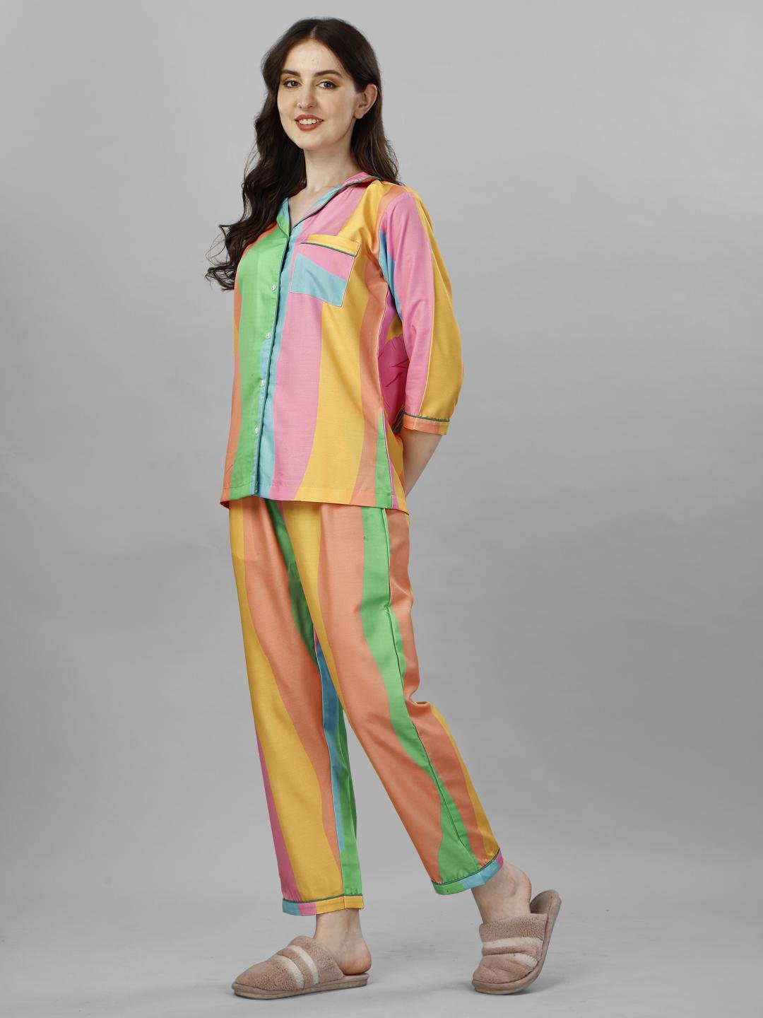 Brighten your everyday style with the Rainbow Bloom Striped Co-ord Set, designed in a playful mix of sunshine yellow, coral pink, mint green, and aqua blue. The vertical stripe pattern creates a flattering, elongating silhouette, while the soft, lightweight fabric ensures all-day comfort. Featuring a button-down shirt with a relaxed collar and matching straight-fit trousers, this set is perfect for lounging, travel, or cheerful casual wear.