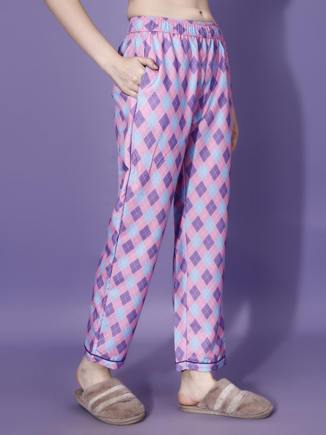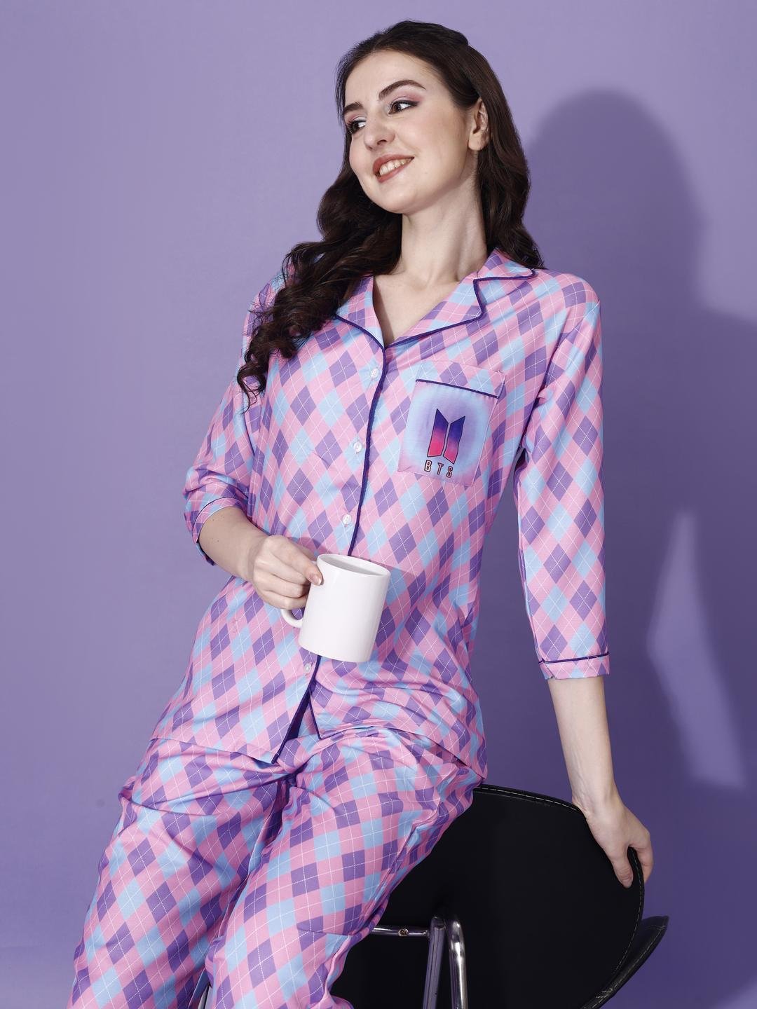 Relax in style with this comfortable two-piece pajama set, featuring a vibrant argyle pattern in pink, blue, and purple. The long-sleeved button-down top includes a classic notch collar and a chest pocket accented with the BTS logo. Paired with matching full-length pants, this set is perfect for lounging at home or a cozy night's sleep.