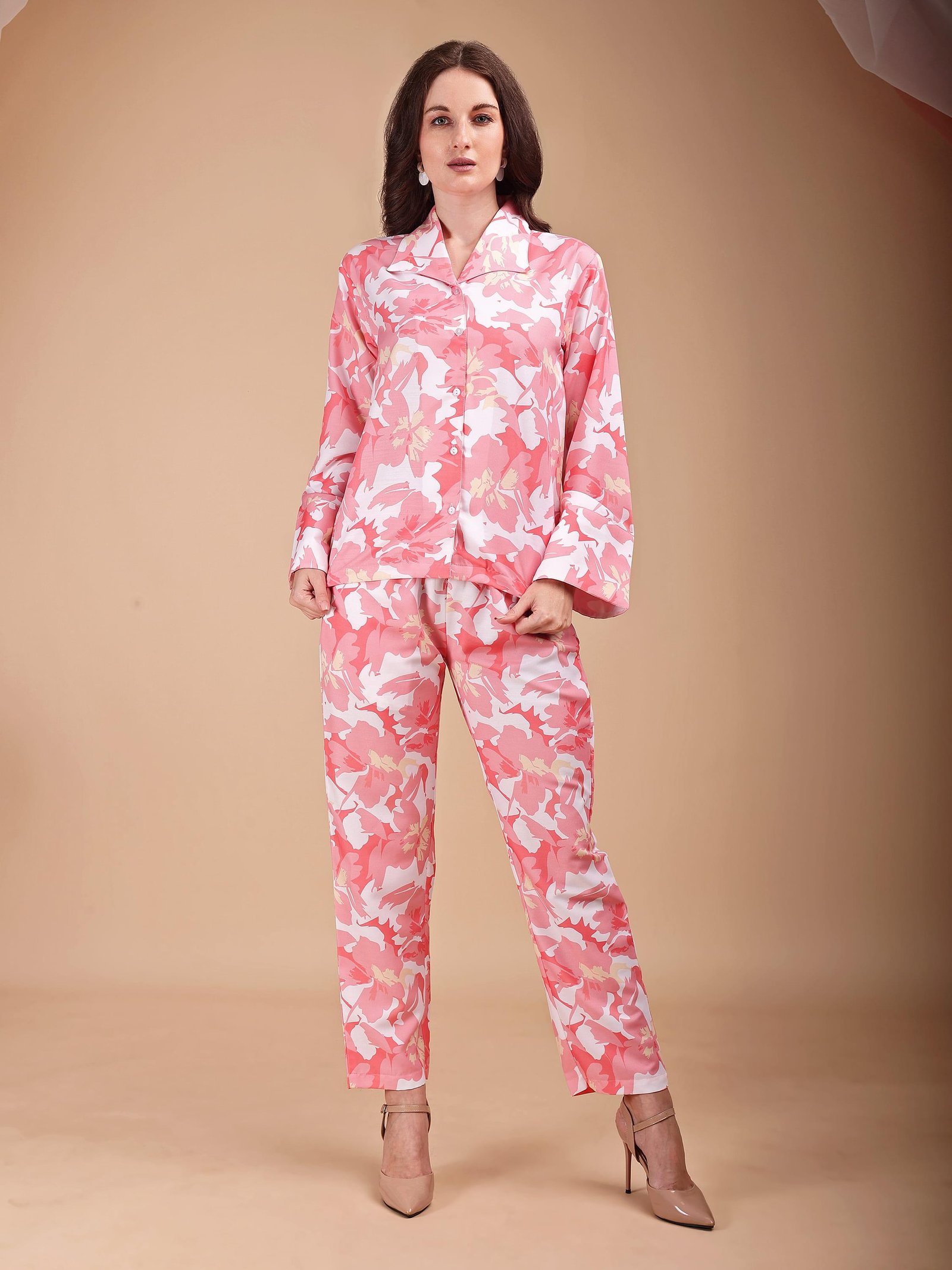 Step into refined comfort with our Coral Bloom Floral Co-ord Set, crafted in a graceful blend of coral pink, soft blush, and ivory tones. Featuring an elegant all-over floral print, this set balances femininity and modern style effortlessly. The tailored button-down top paired with straight-fit trousers makes it perfect for relaxed days, stylish lounging, or elevated casual wear. Soft hues and fluid fabric ensure a fresh, flattering look throughout the day.