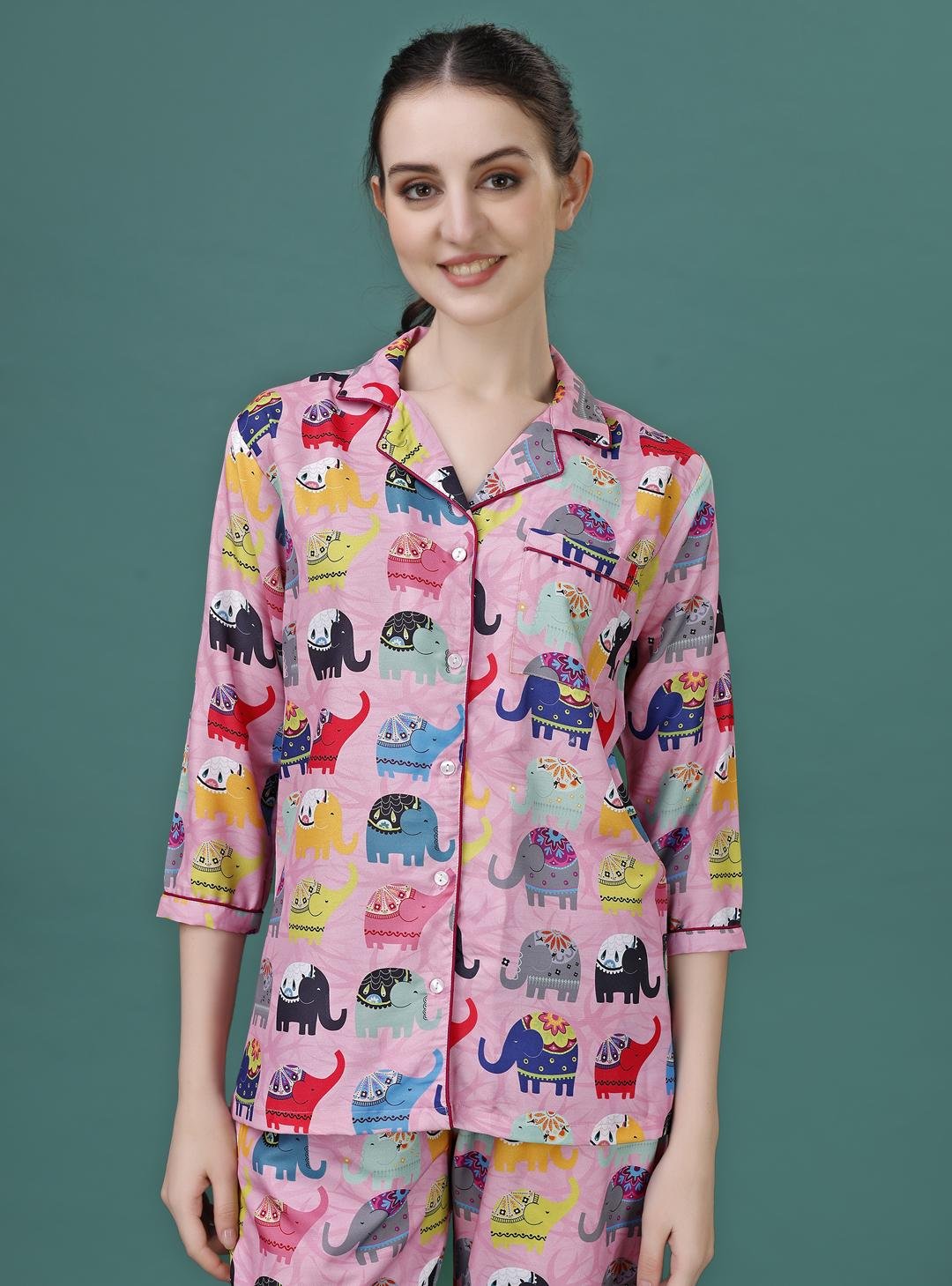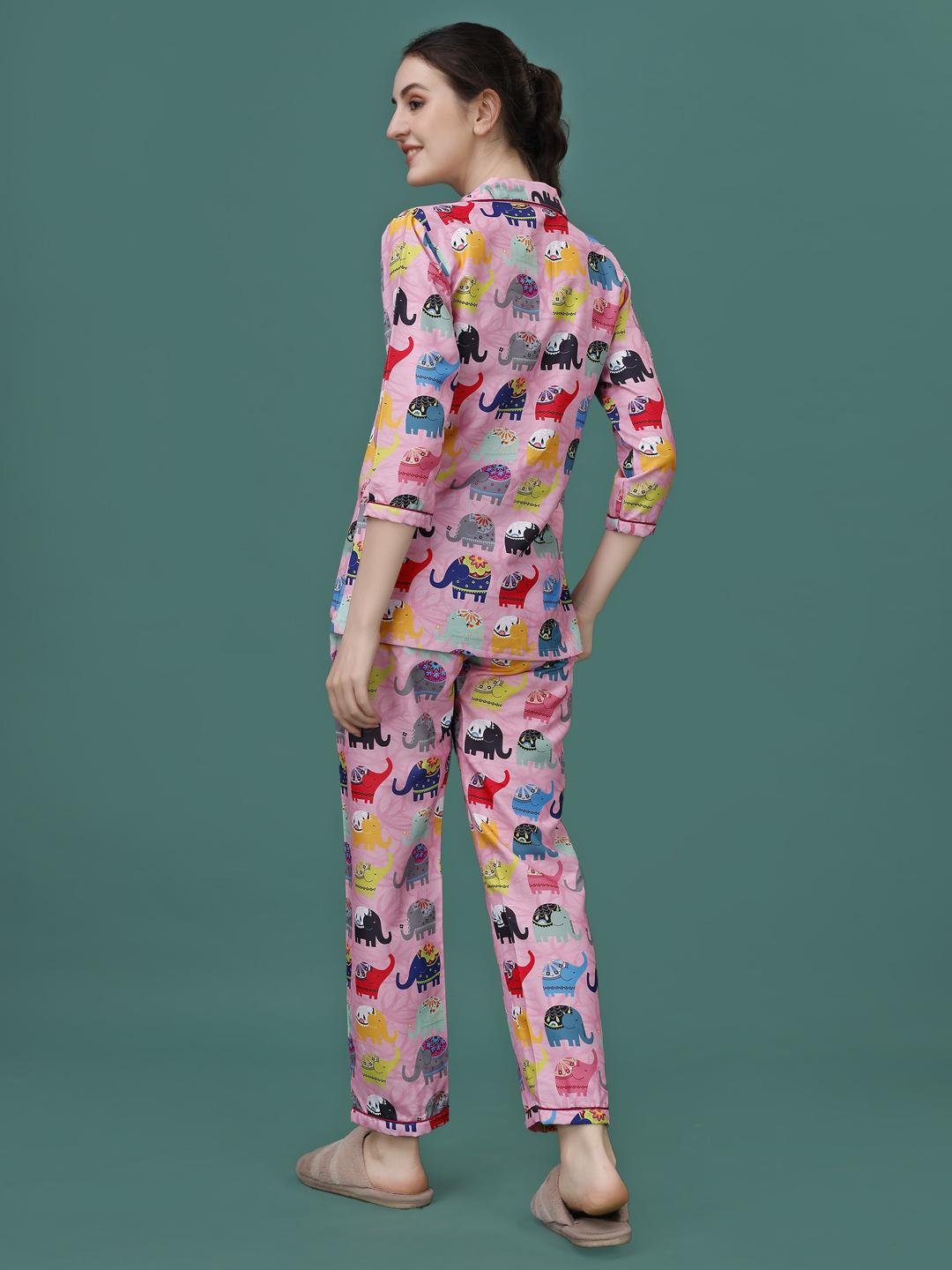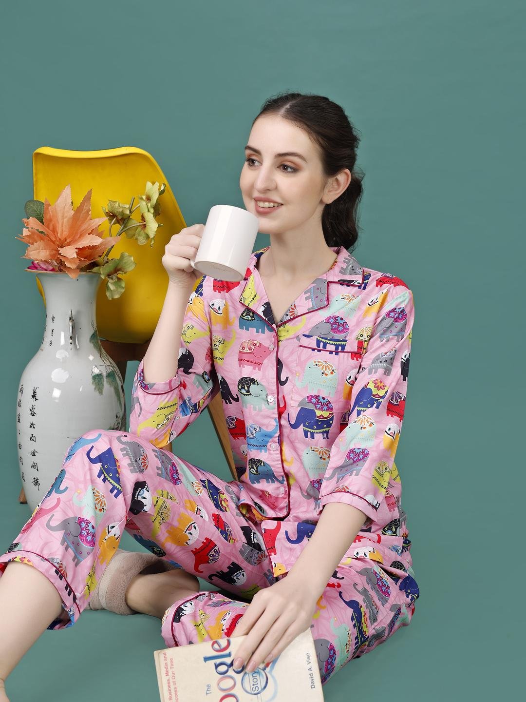 Sleep in playful comfort with the Pink Elephant Parade Women’s Nightwear Pajama Set. Designed in a cheerful bubblegum pink base, this set features adorable multicolor elephant prints that add a fun, youthful charm. The shirt-style top with button closure and contrast piping pairs perfectly with relaxed-fit pajama pants. Crafted from soft, breathable fabric, this nightwear set ensures all-night comfort and effortless lounging at home.