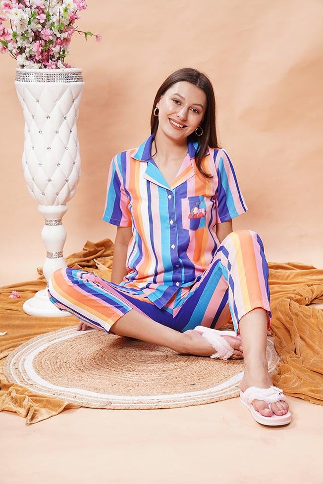 Brighten up your nightwear wardrobe with this stylish women’s multicolor striped night suit set. Featuring a trendy button-down shirt style top with short sleeves and a matching full-length pajama, this set combines comfort with modern design. The vibrant vertical stripes in shades of orange, blue, pink, and white add a cheerful touch, while the soft, breathable fabric ensures all-night comfort. Ideal for sleeping, lounging, or relaxed home wear, this night suit is a perfect blend of fashion and ease.