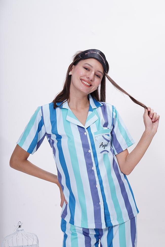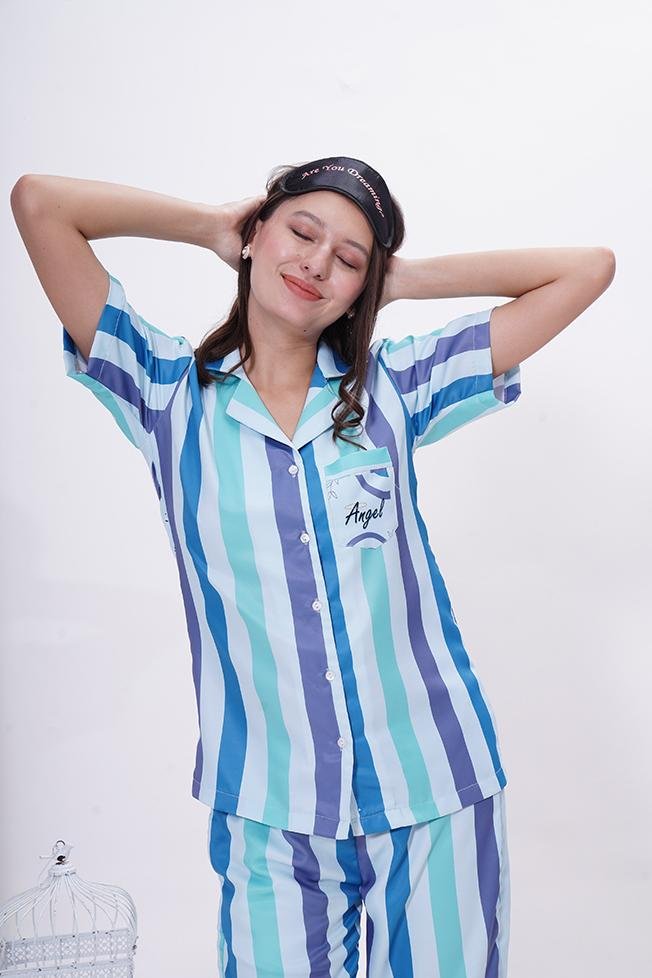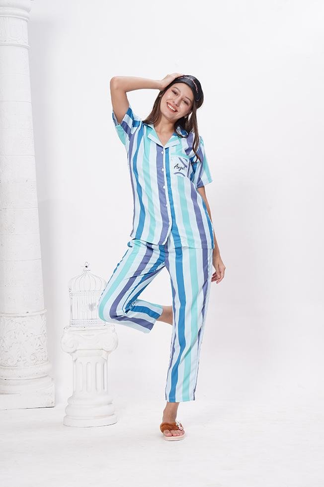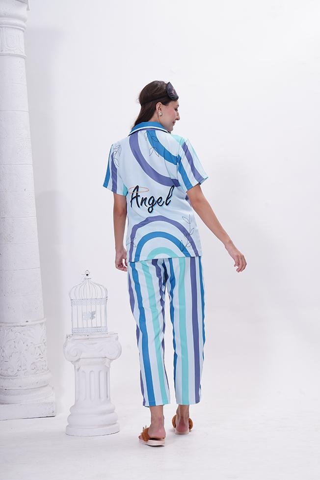Upgrade your sleepwear wardrobe with this stylish and comfortable Women’s Blue & White Vertical Stripe Night Suit Set. Designed with soothing pastel stripes, this nightwear set features a short-sleeve button-front shirt paired with matching straight-fit pajama pants. Crafted from soft, breathable cotton fabric, it ensures maximum comfort for restful sleep and relaxed lounging. The classic striped pattern gives it a timeless look, making it ideal for nightwear, morning routines, and all-day home wear.