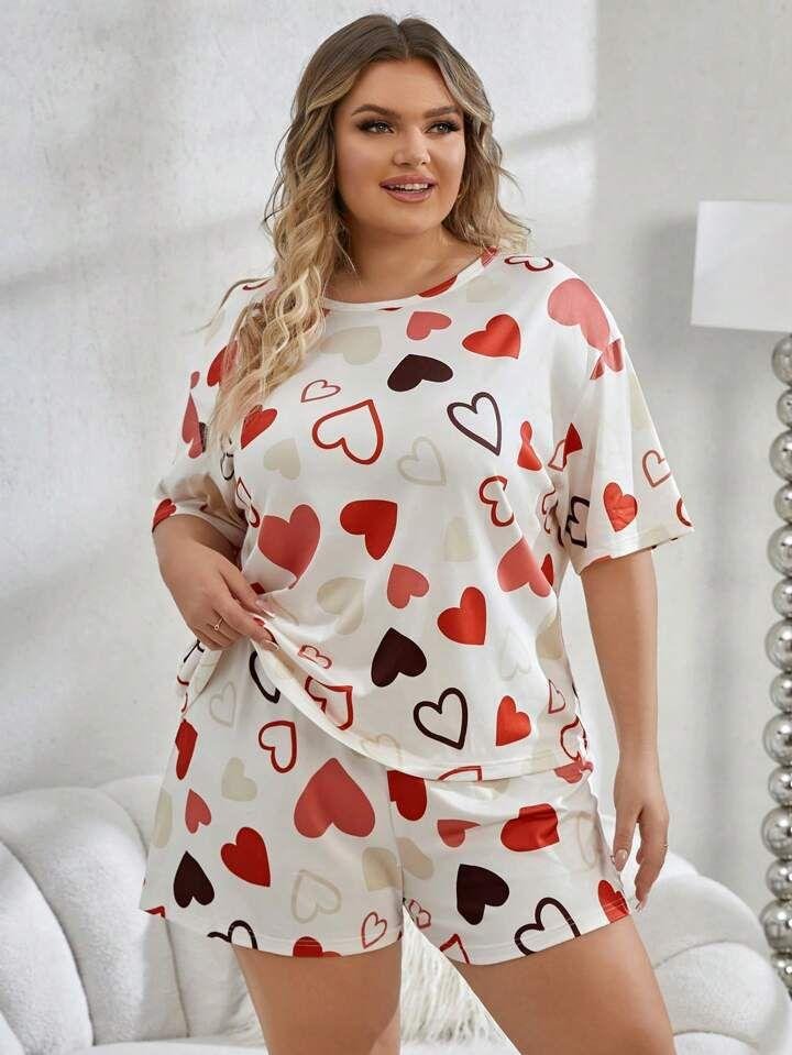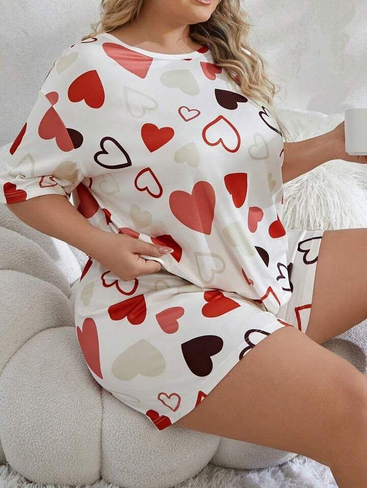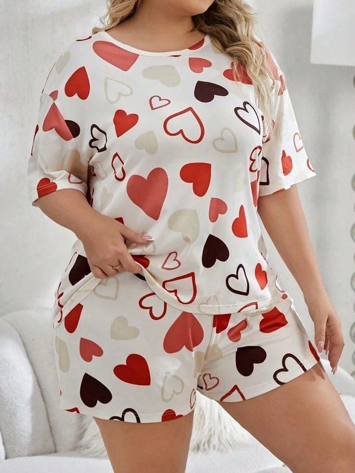 Cream White Heart Print Short Night Suit for Women