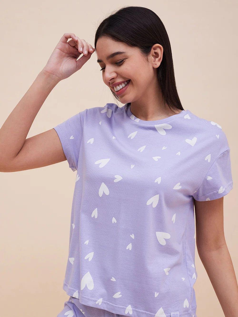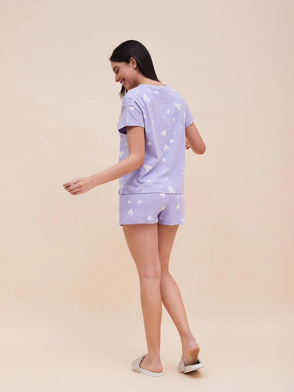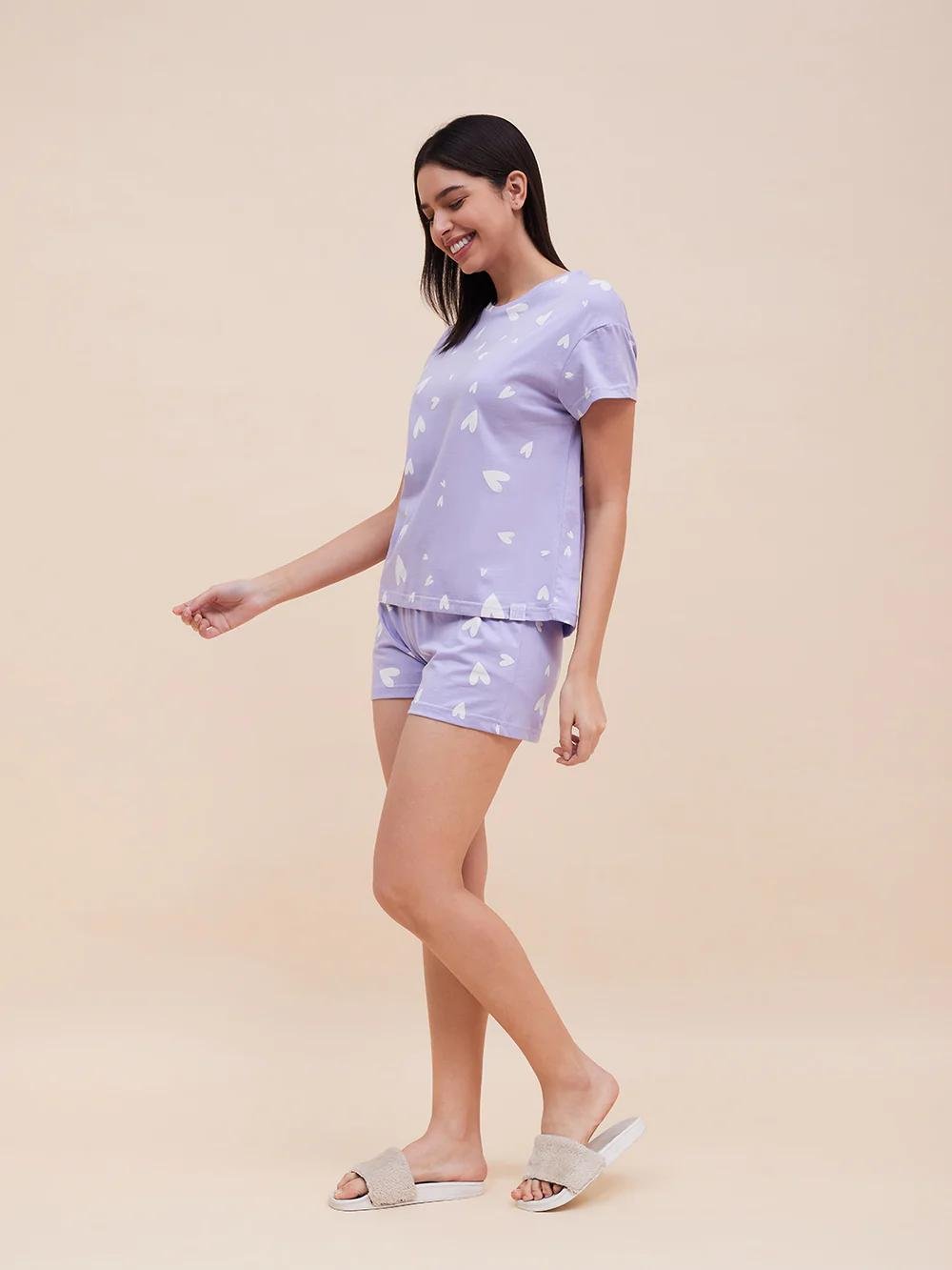 Relax in style with this elegant women’s lavender nightwear co-ord set, designed for maximum comfort and a soothing look. The set includes a short-sleeve round-neck T-shirt paired with matching shorts, making it ideal for nightwear, sleepwear, or all-day lounging at home.