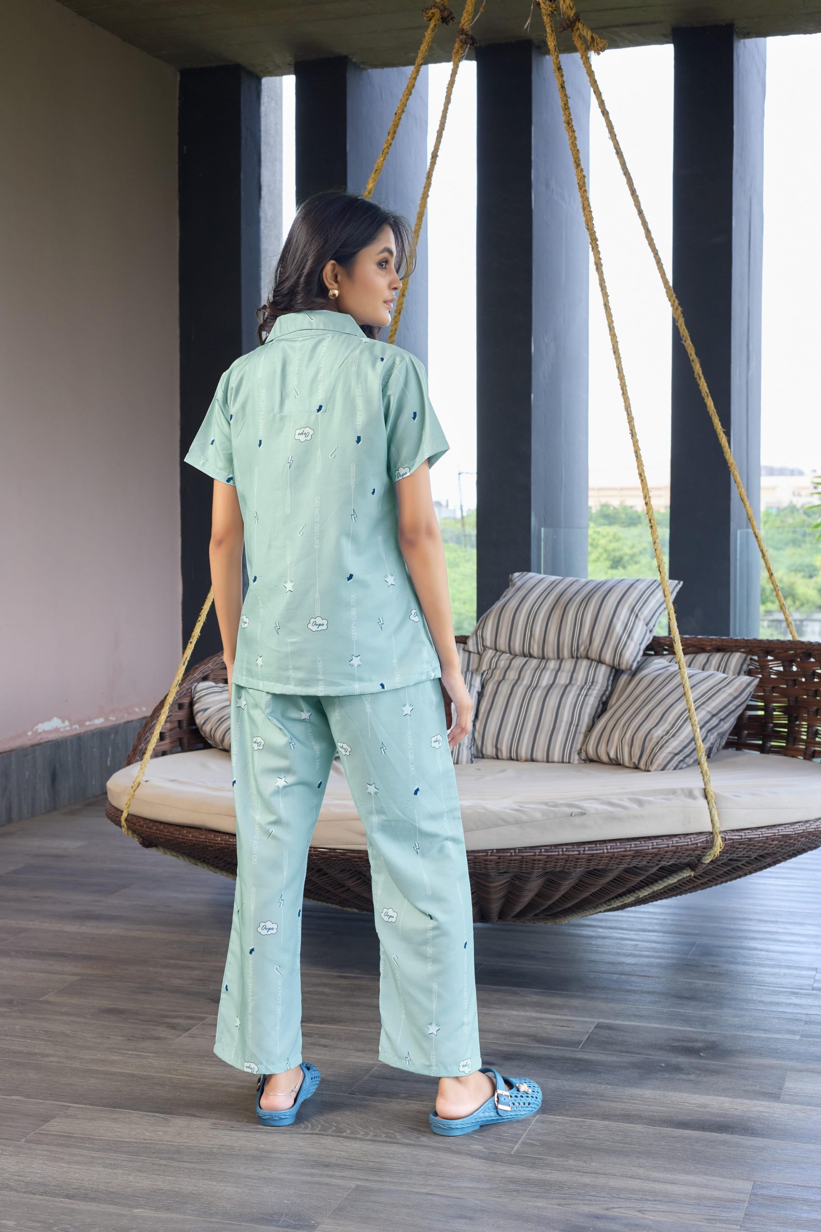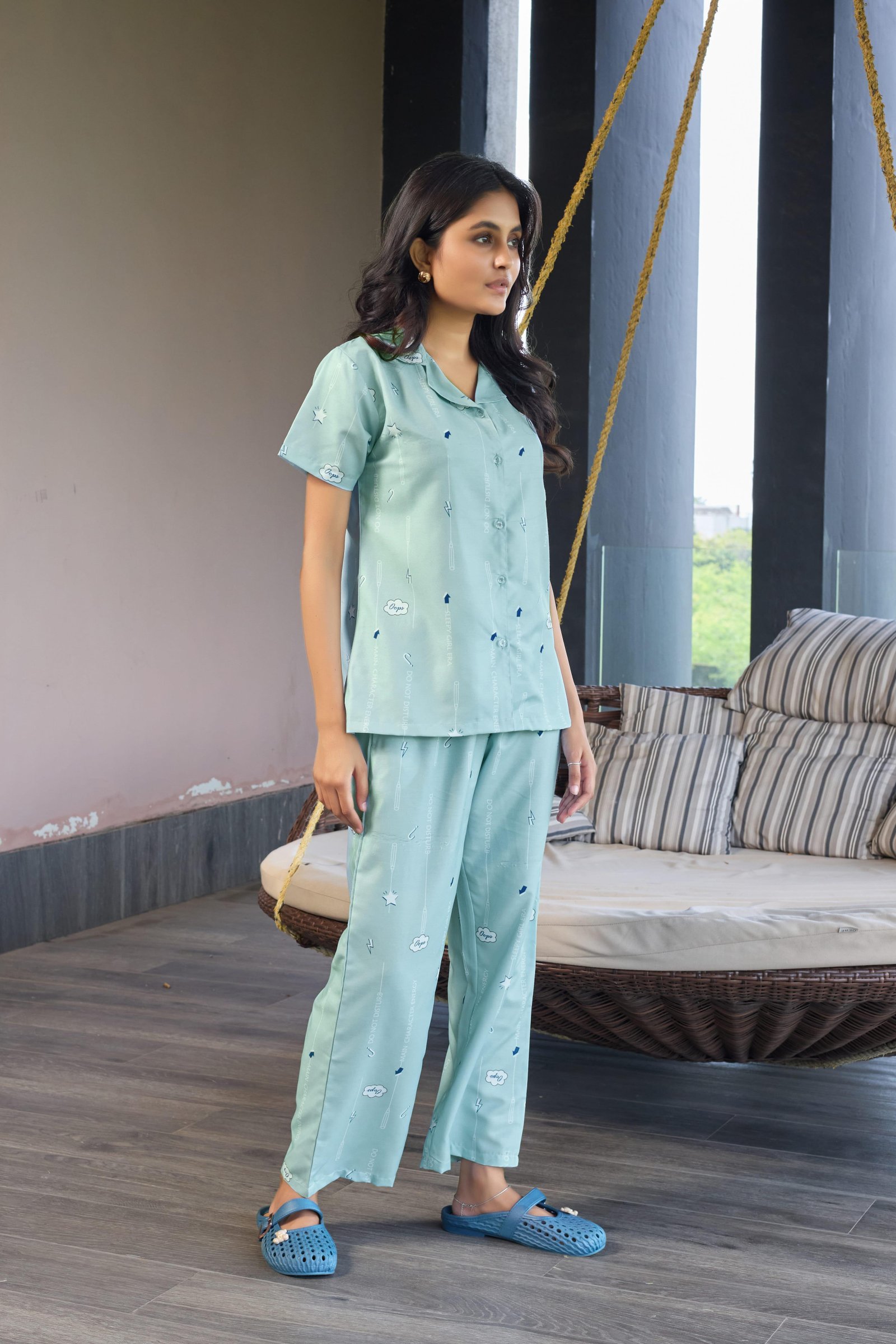 Step into calm comfort with the Mint Breeze Pastel Green Nightwear Set. Designed in a refreshing mint green shade with delicate all-over prints, this two-piece set offers a soothing and modern look. The short-sleeve button-down shirt provides a relaxed fit, while the straight-fit pajama pants ensure ease of movement. Soft on the skin and lightweight, this set is perfect for nightwear, lounging, or relaxed indoor wear.