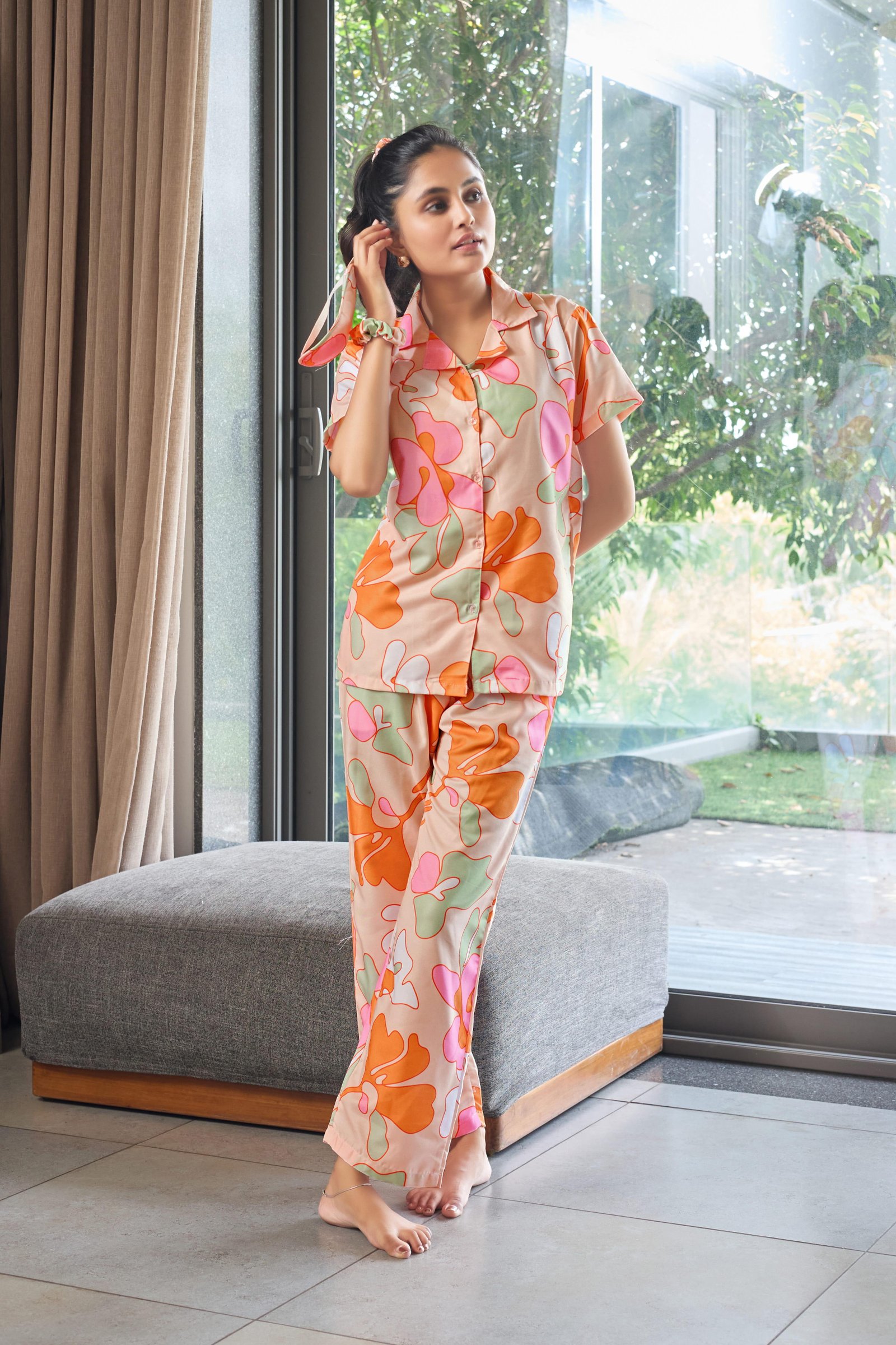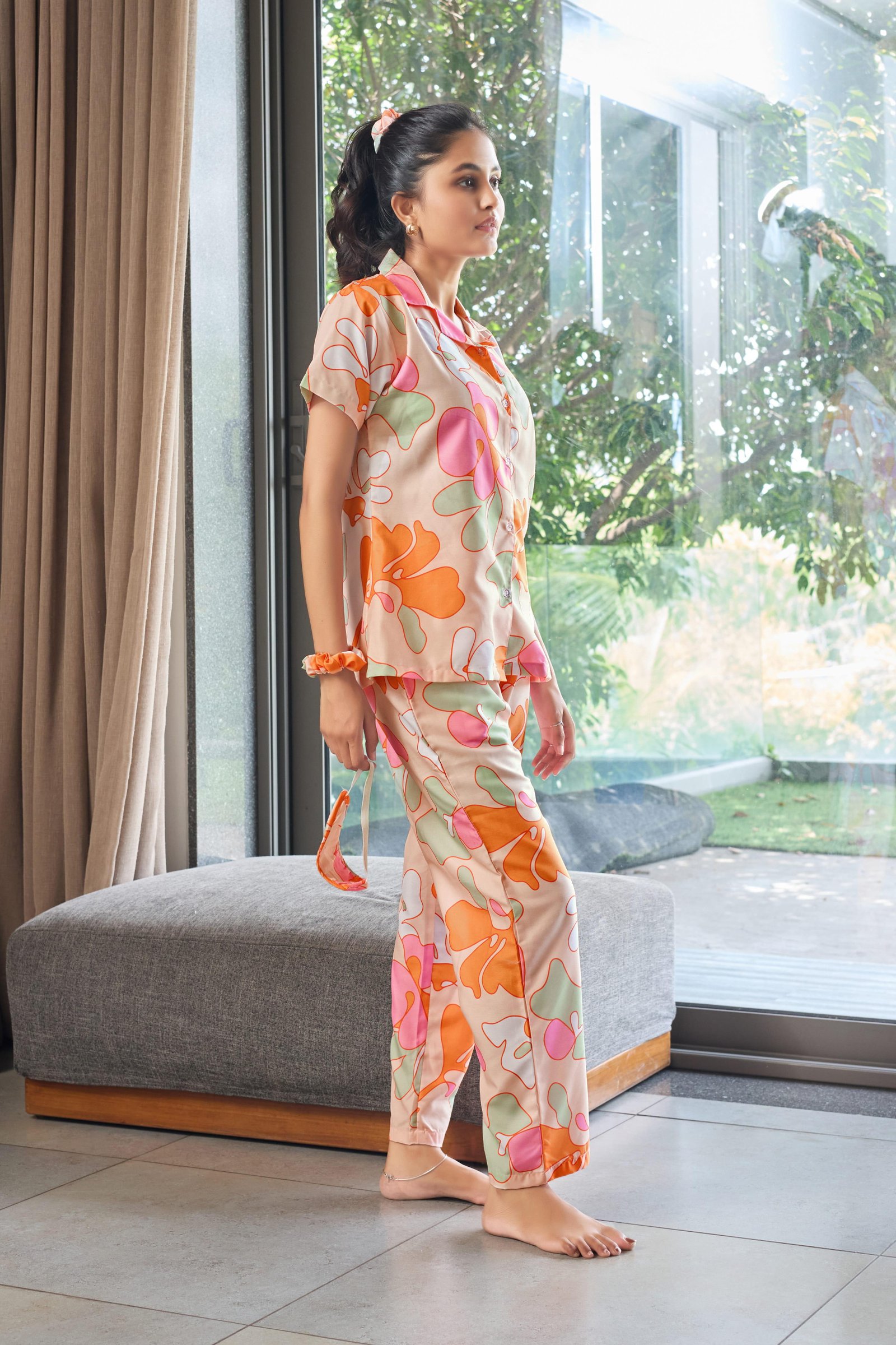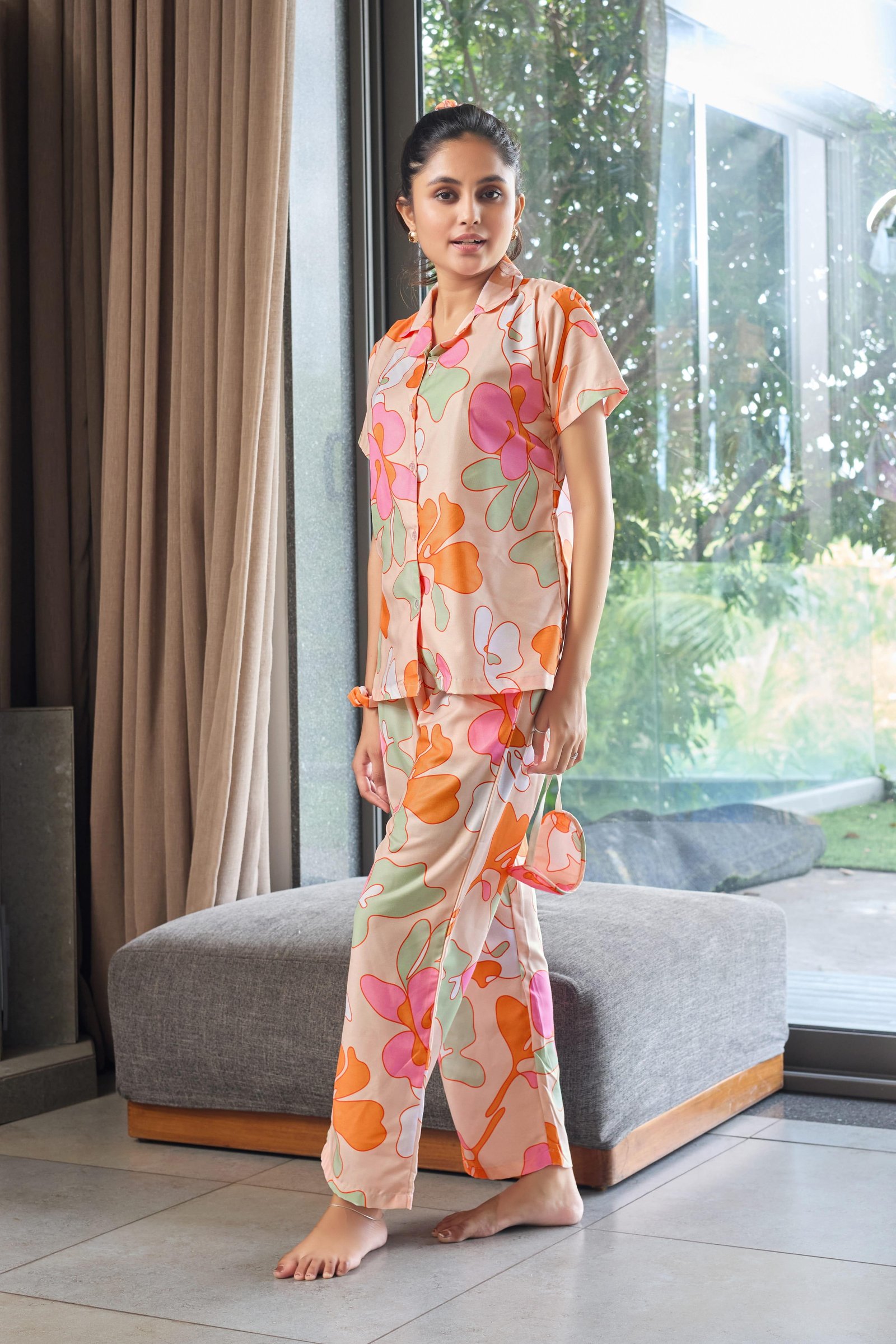 Brighten your downtime with the Peach Bloom Abstract Print Nightwear Set. Designed in a soft peach base with playful abstract floral shapes in orange, blush pink, and mint green, this two-piece set brings a fresh, cheerful vibe to your lounge routine. The short-sleeve, button-down shirt with a relaxed collar pairs effortlessly with straight-fit pajama pants, offering breathable comfort and easy movement—perfect for sleep, lounging, or relaxed home wear.