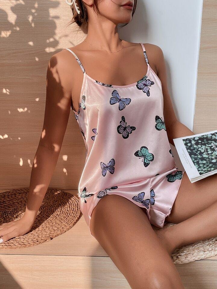 Satin Butterfly Print Women's Nightwear Shorts Set