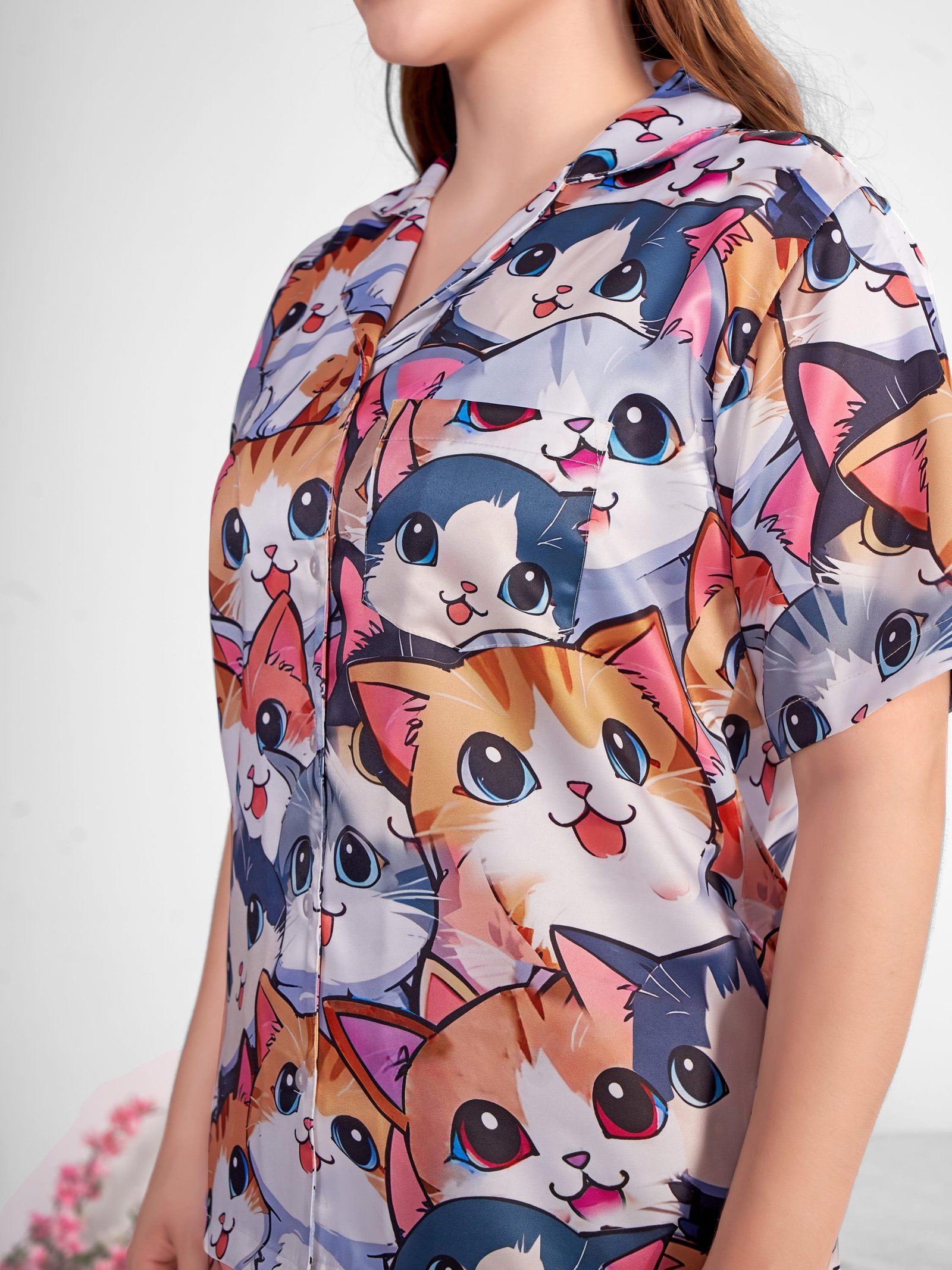 Add a fun and playful touch to your nightwear collection with this Women’s Multicolor Cat Print Night Suit Set. Designed with an adorable all-over cartoon cat print, this set includes a short-sleeve button-down shirt paired with matching shorts. Crafted from soft, breathable fabric, it offers ultimate comfort for sleeping, lounging, or relaxing at home. The lightweight material and relaxed fit make it perfect for everyday nightwear, especially during warm weather.