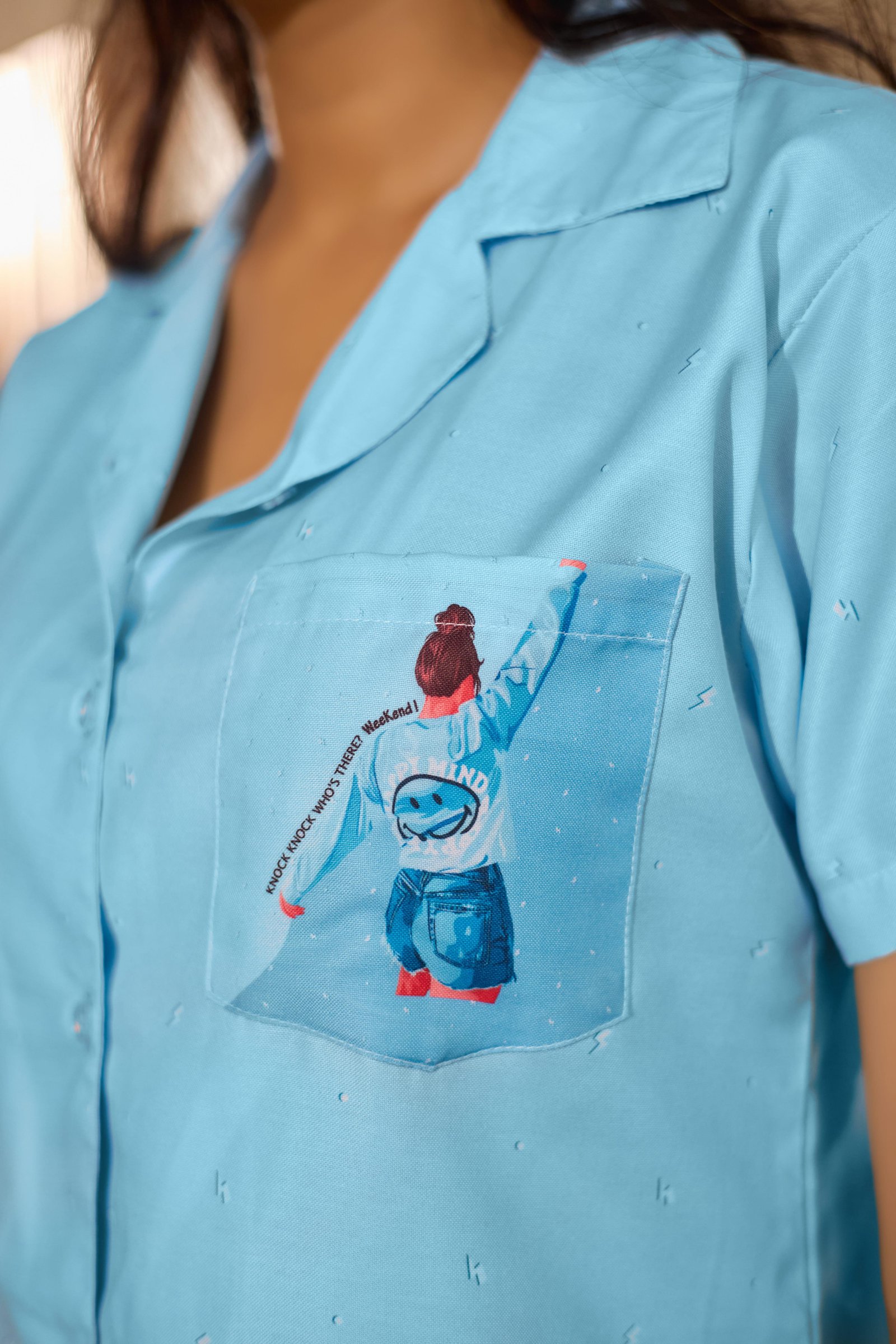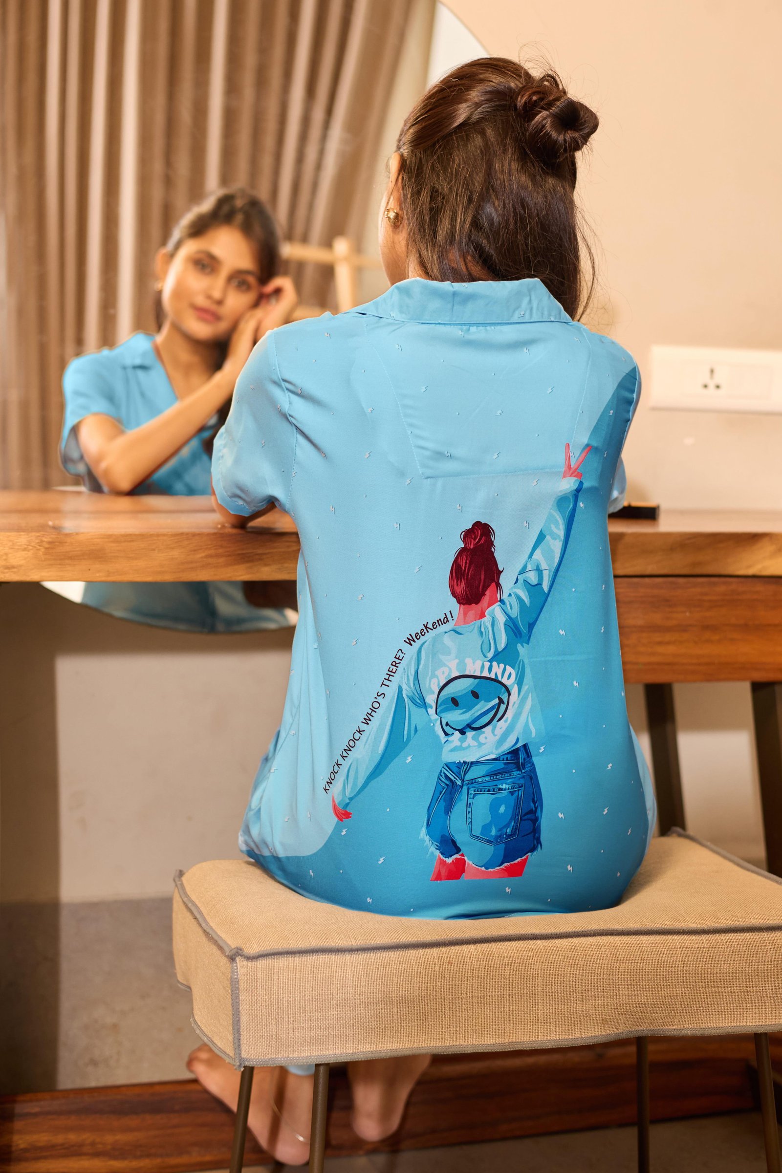 Experience soothing comfort with the Sky Calm Light Blue Nightwear Set. Designed in a refreshing sky-blue shade, this elegant two-piece set features a short-sleeve, button-down shirt paired with straight-fit pajama pants. The minimal solid color with subtle detailing gives it a clean, graceful look—perfect for peaceful sleep, relaxed mornings, and all-day home lounging.